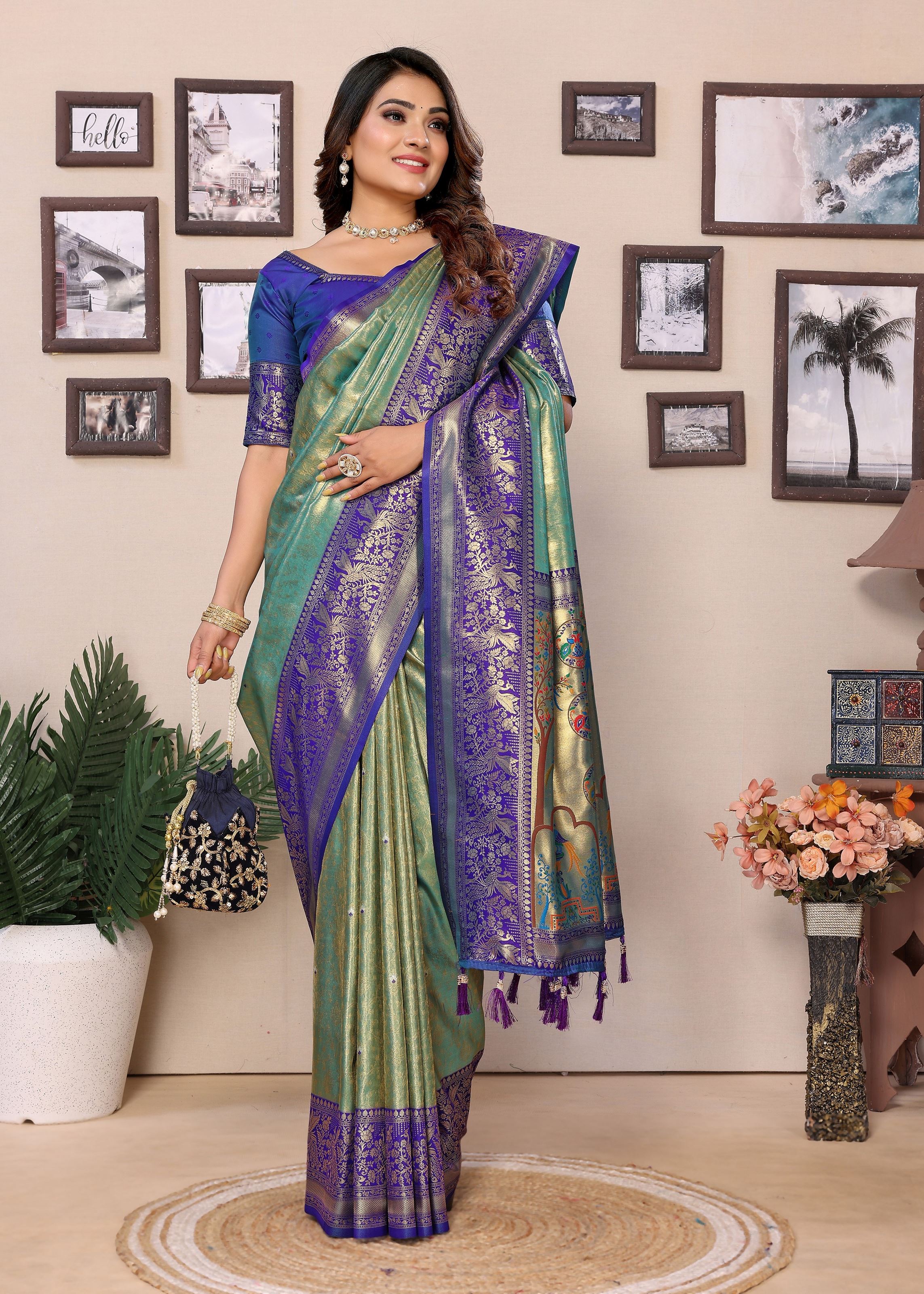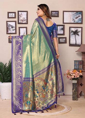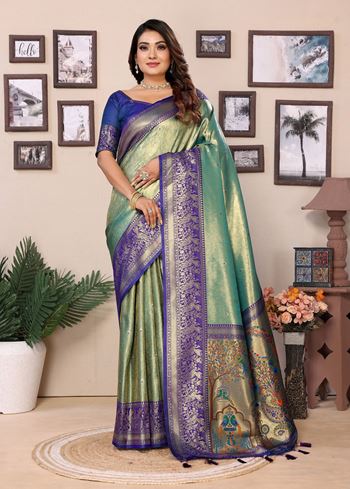 The soothing sea green base is beautifully paired with a contrasting blue silk blend blouse, creating a striking and refined ensemble. Its luxurious tissue silk fabric drapes gracefully, highlighting the detailed woven Jari patterns while ensuring comfort and a flattering fit. Designed for women who value authentic craftsmanship and elegant traditional style, this designer saree makes a statement at bridal functions, festive gatherings, and special celebrations.