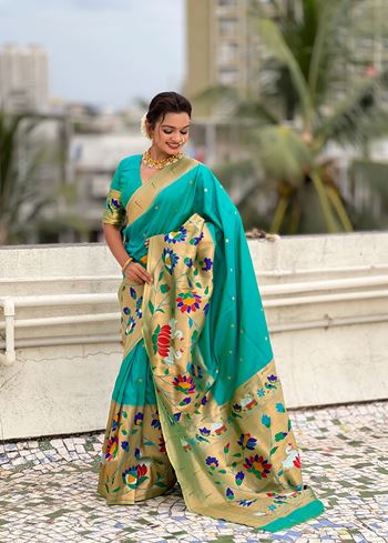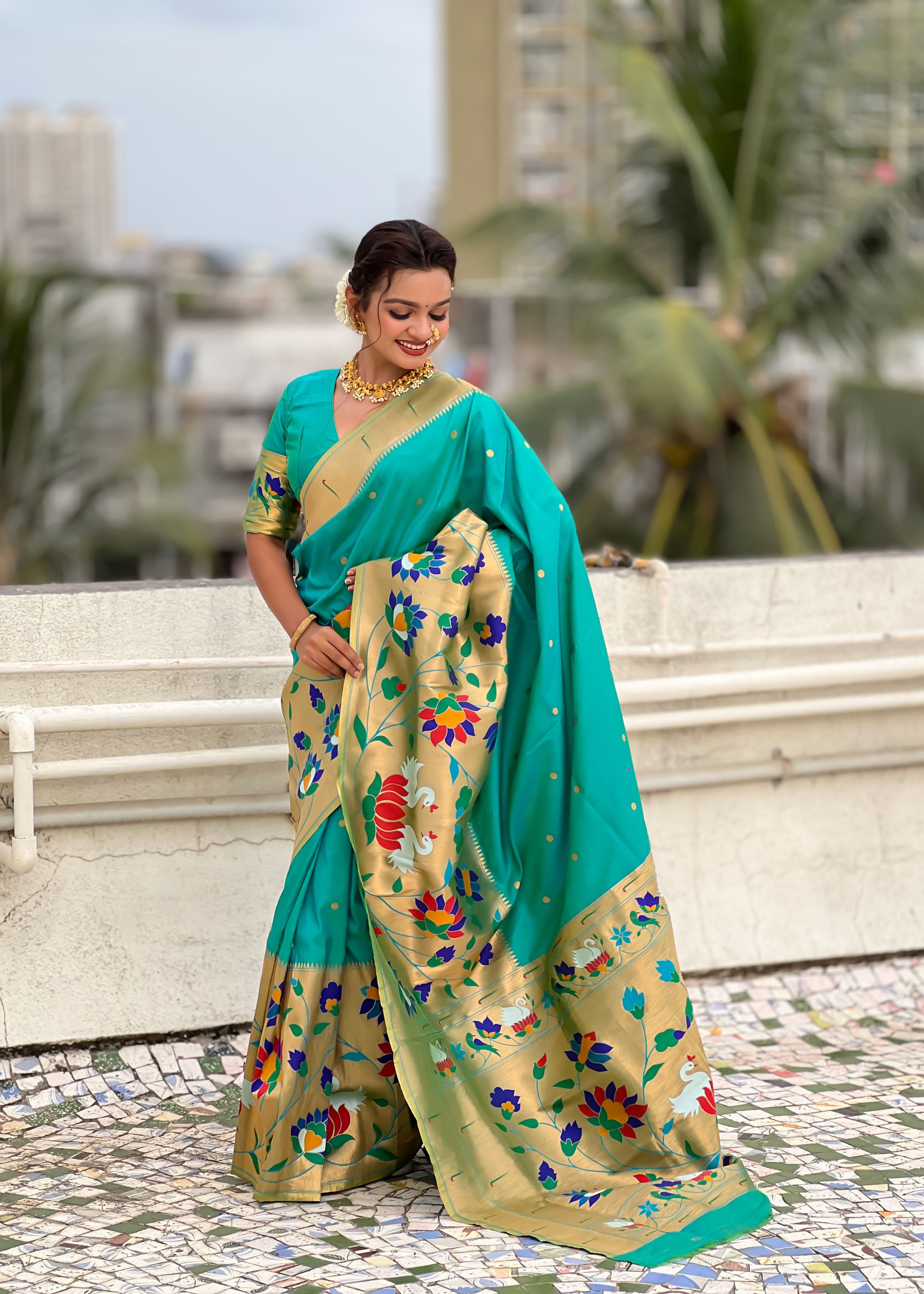 Sea Green Beautiful Woven Meenakari Polka Designer Paithani Silk Ethnic Graceful Saree