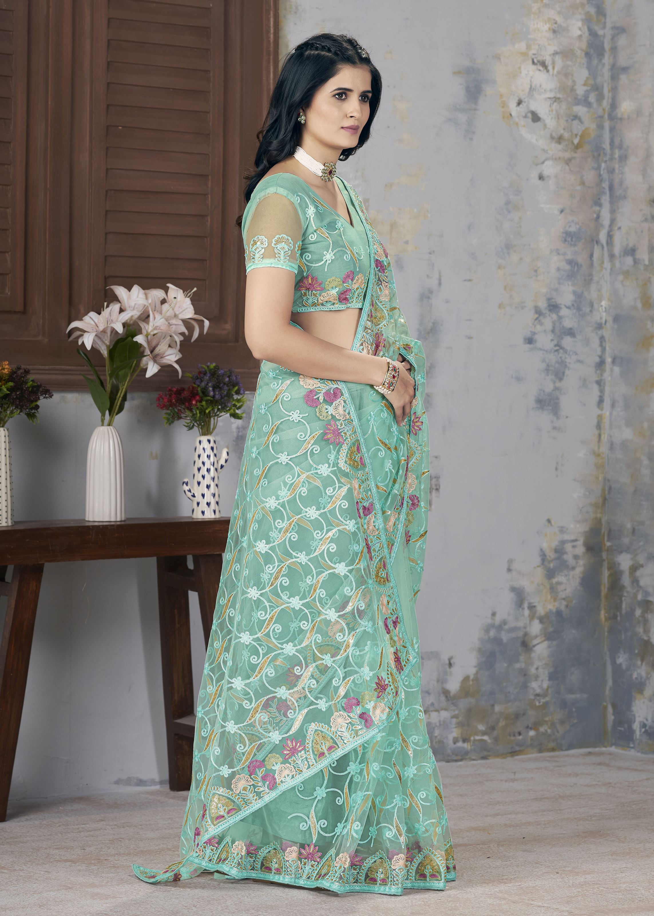 Paired with a matching sea green net blouse, the ensemble creates a cohesive and stylish appearance. The lightweight net fabric ensures effortless draping and comfort, while the intricate embroidery highlights expert craftsmanship and contemporary design. Perfect for making a statement at parties or formal events, this saree combines elegance with modern aesthetics.