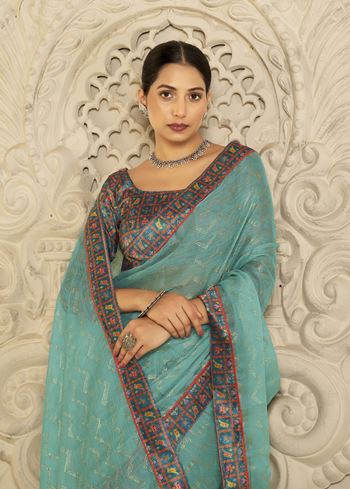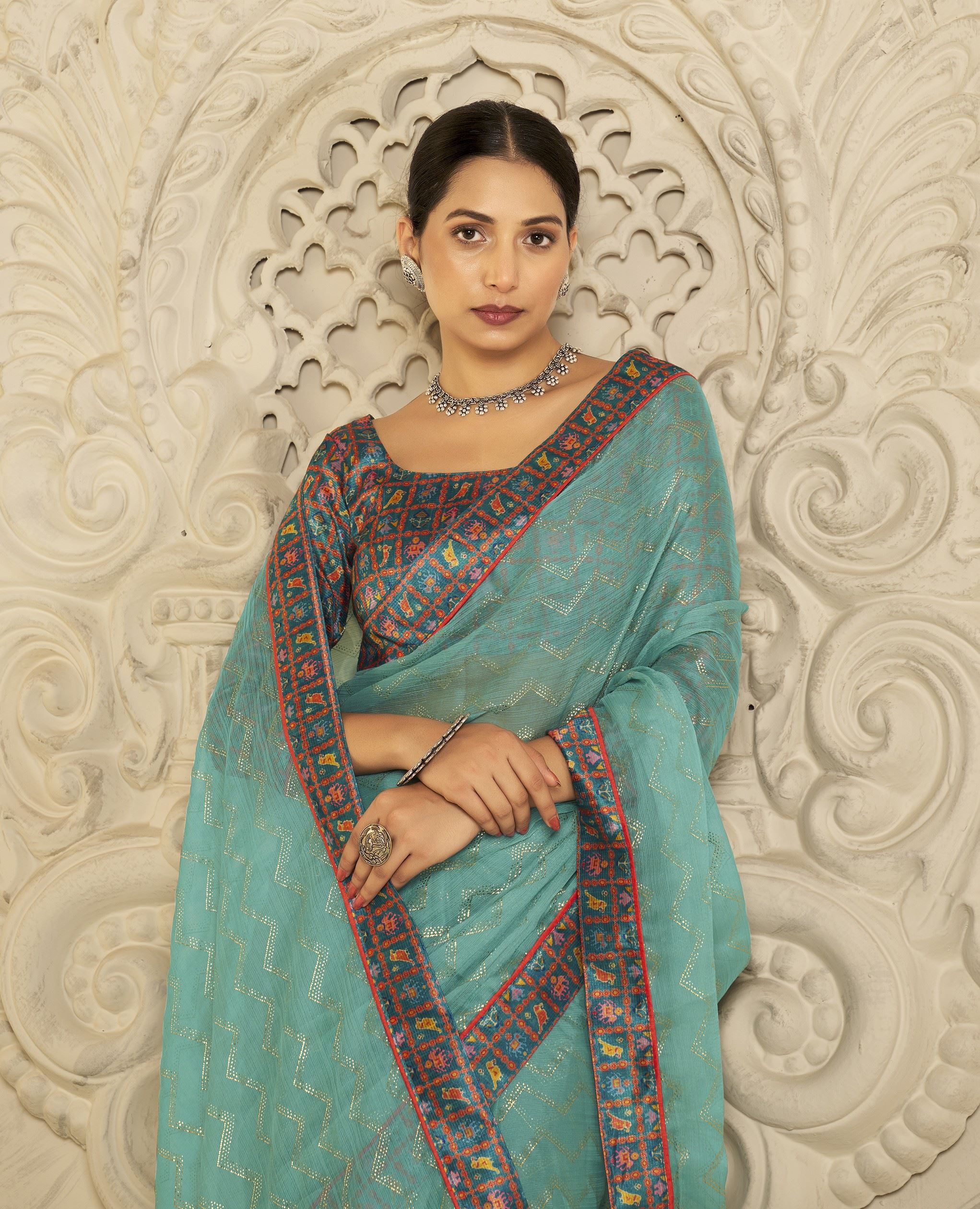 This saree comes with a matching sea green chiffon blouse, allowing you to experiment with different blouse styles – from traditional embroidery to chic modern cuts – to suit your personal fashion statement.