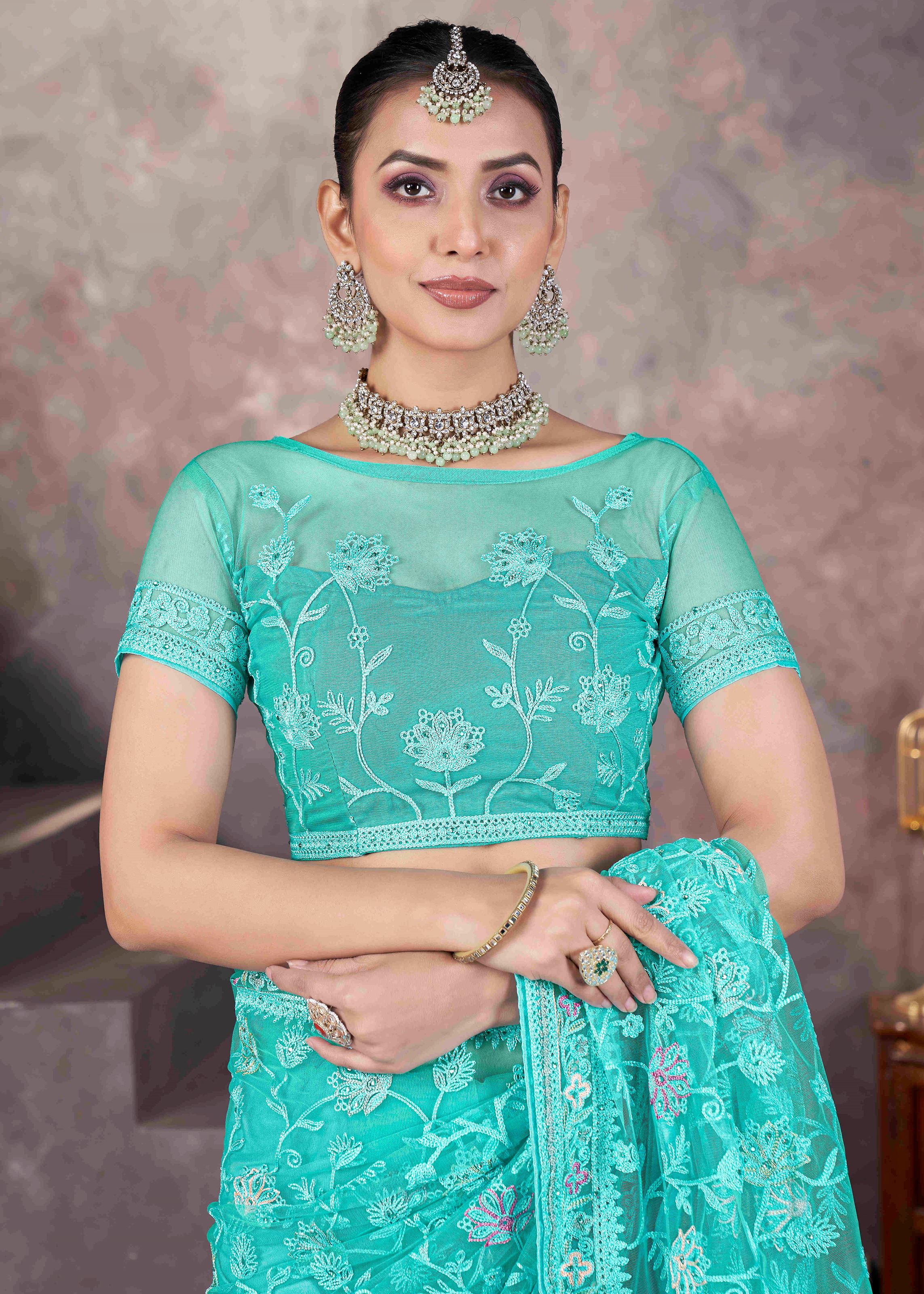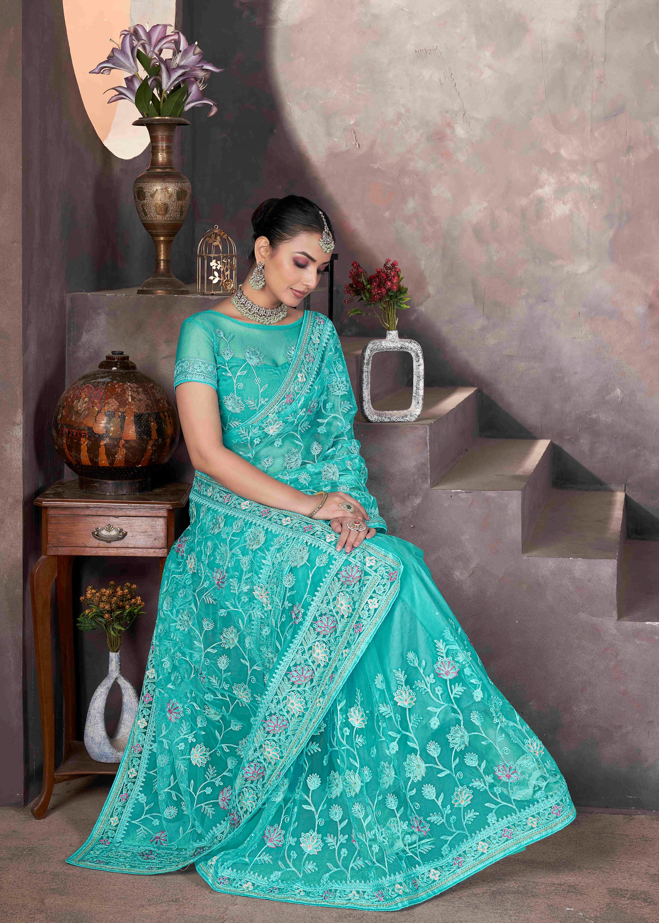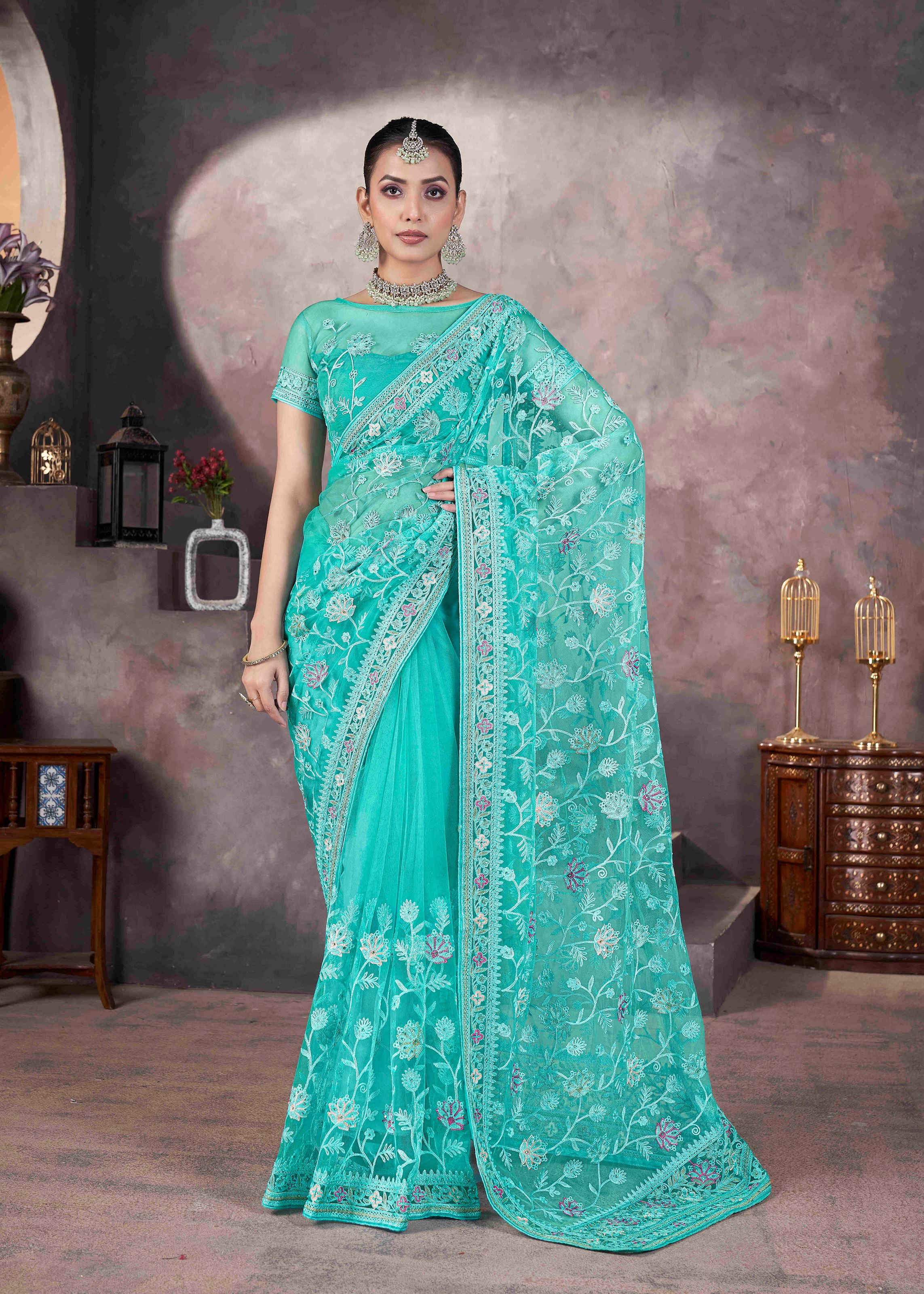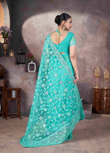 Accompanied by a matching sea green net blouse, this ensemble ensures a seamless and elegant appeal. The blouse is designed to complement the embroidery work, making the outfit even more alluring. Pair it with sparkling jewelry, stylish footwear, and a chic hairstyle to make a statement at any ceremonial occasion.If you are looking for a stylish yet traditional saree that reflects elegance and class, this embroidered net saree is your go-to choice. Make it a part of your ethnic wardrobe and exude timeless charm at every special event.
