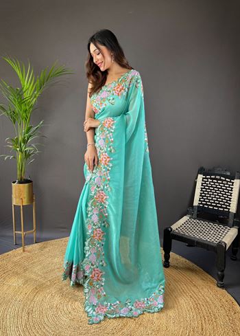 Sea Green Glossy Silk Cross Stich Embroidery Cut Work Adorable Partywear Girlie Saree