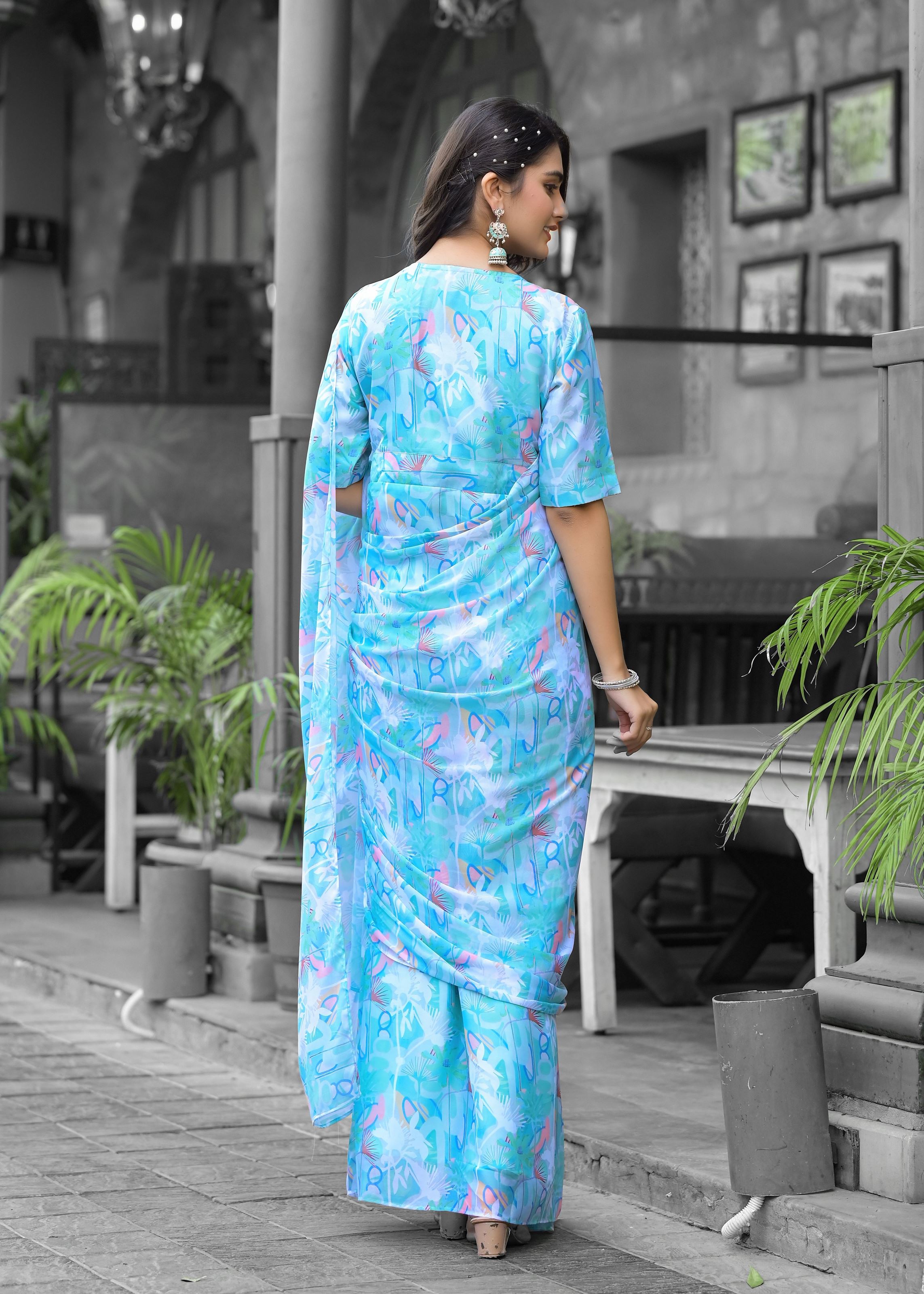 Sea Green Imported Georgette Designer Digital Printed Ready To Wear Gown Style Saree