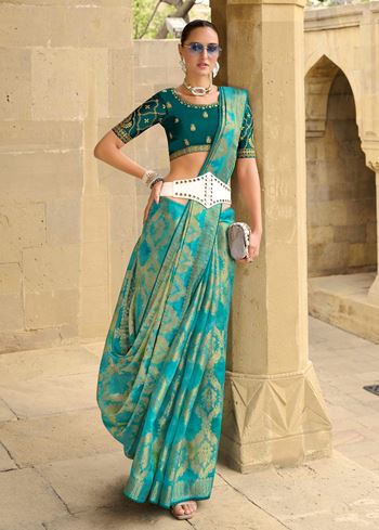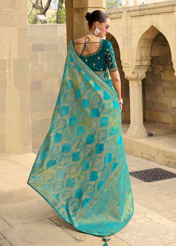 Sea Green Jacquard Silk Woven Saree With Embroidered Blouse