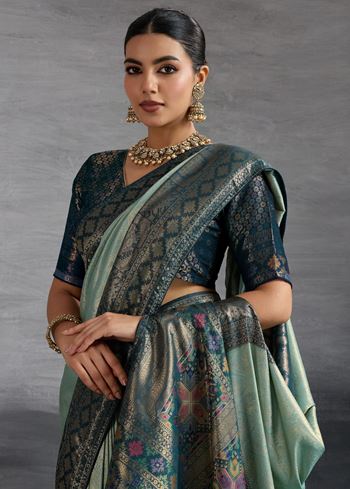 Sea Green Kanjivaram Soft Silk Saree with Zari Patta and Meenakari Pallu