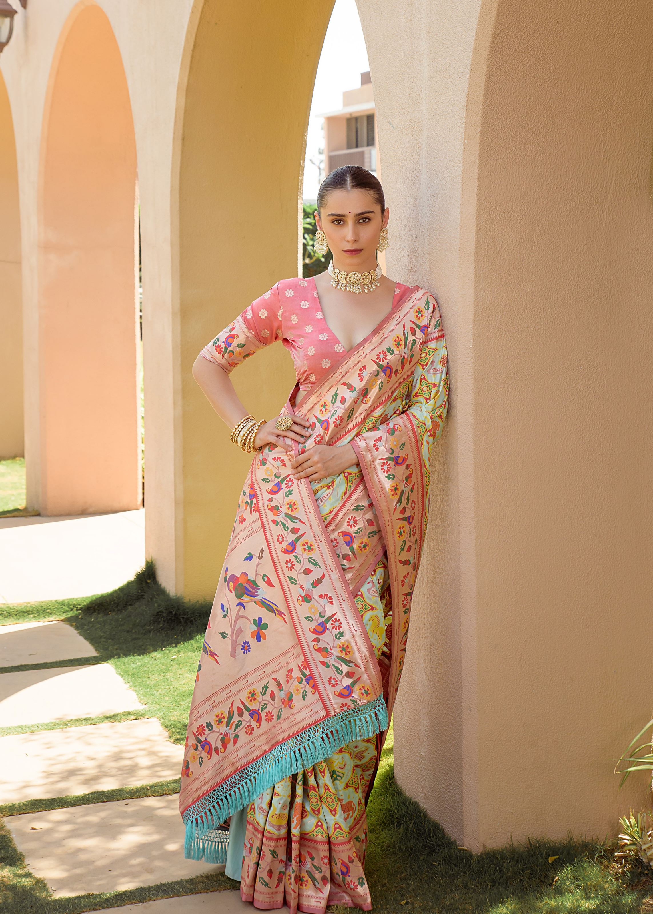 The saree is beautifully paired with a soft peach Paithani silk blouse, creating a refined contrast that elevates the look without overpowering it. The luxurious texture of the silk ensures a graceful drape and lasting comfort, while the pastel pairing brings a contemporary balance to the ensemble.