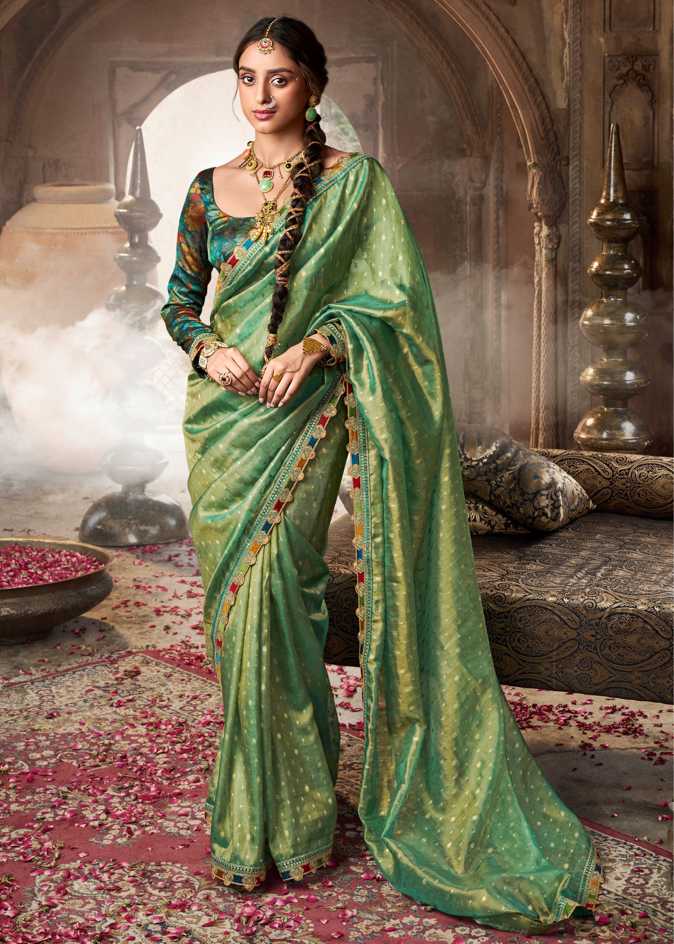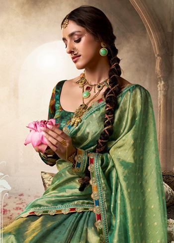 Explore our exclusive online collection of designer sarees, including pure tissue, Banarasi silk, pure silk, modal cotton, georgette, chiffon, and more. This Sea Green Pure Tissue Saree is a must-have addition to your ethnic wardrobe and is available with worldwide shipping, including USA.