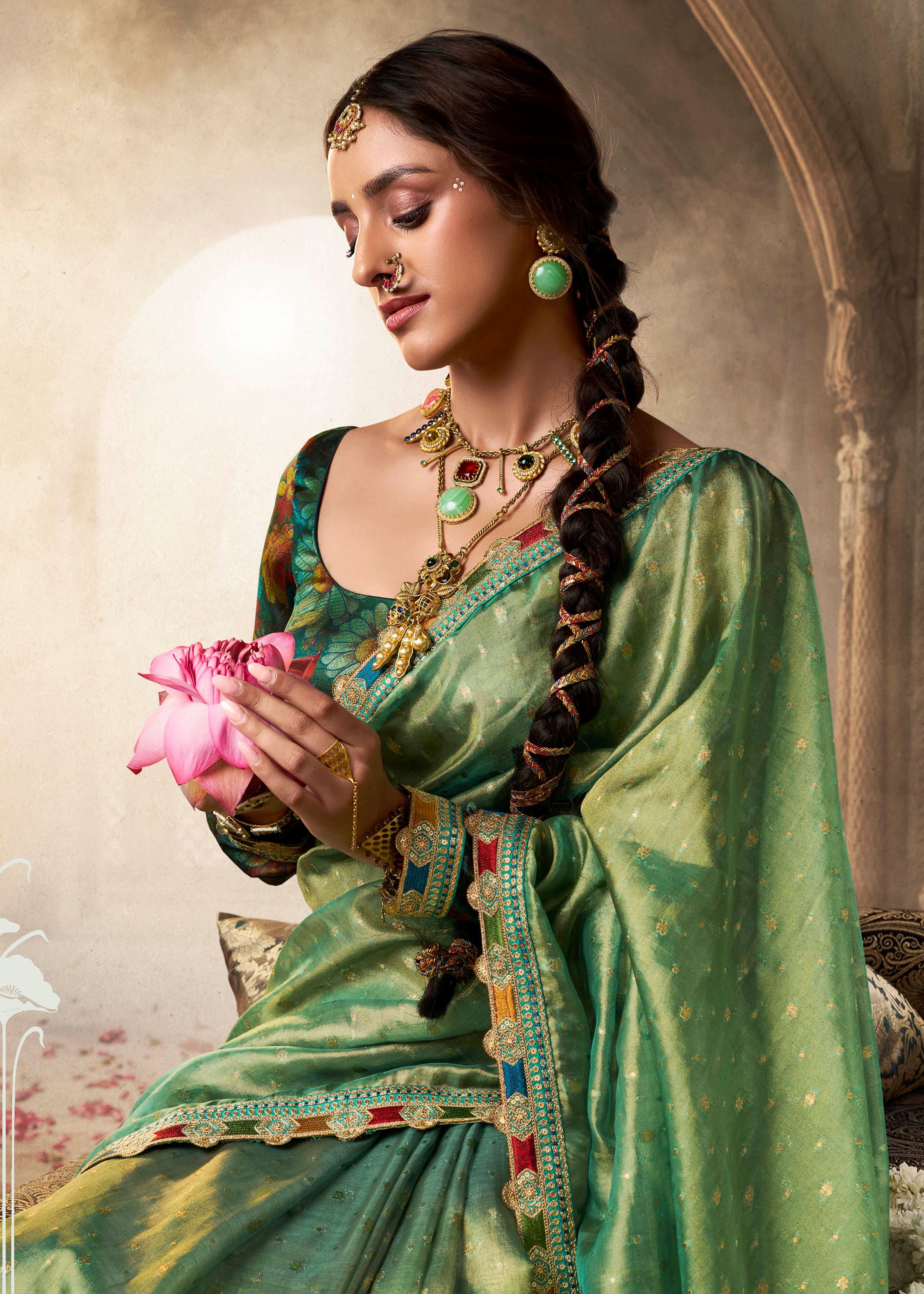 Paired with a multicolor pure tissue blouse, this ensemble creates a striking contrast that enhances the serene sea green hue. The delicate fabric flows gracefully, providing a refined silhouette that combines comfort and style. Ideal for bridal events, parties, or festive gatherings, this saree ensures you stand out with elegance and poise.