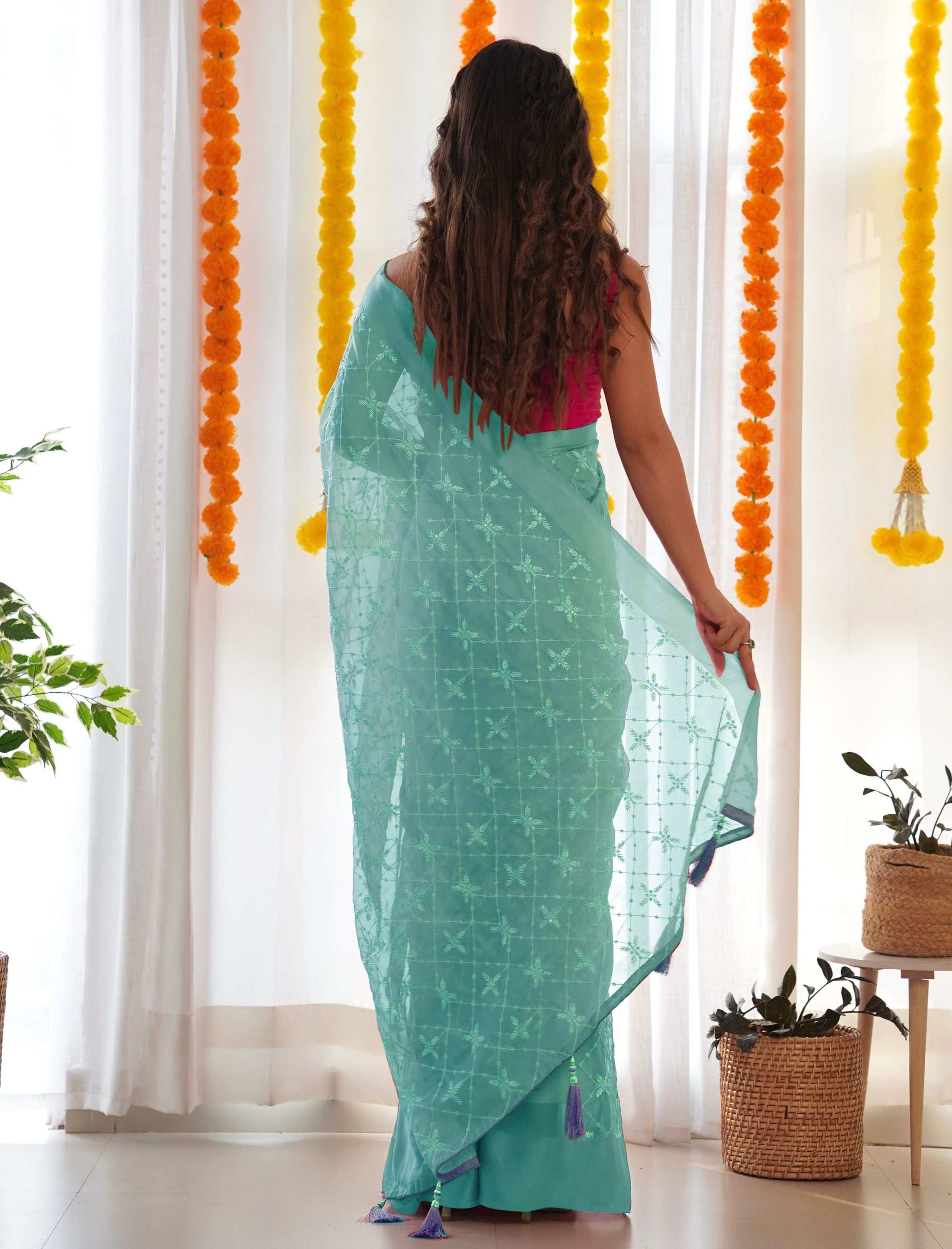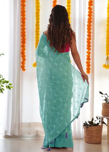 This saree is paired with a contrasting pink art silk blouse, embellished with embroidered detailing to highlight its modern yet traditional appeal. The combination of sea green and pink creates a stunning fusion, making it a statement piece for women who appreciate premium ethnic wear at an affordable price.
