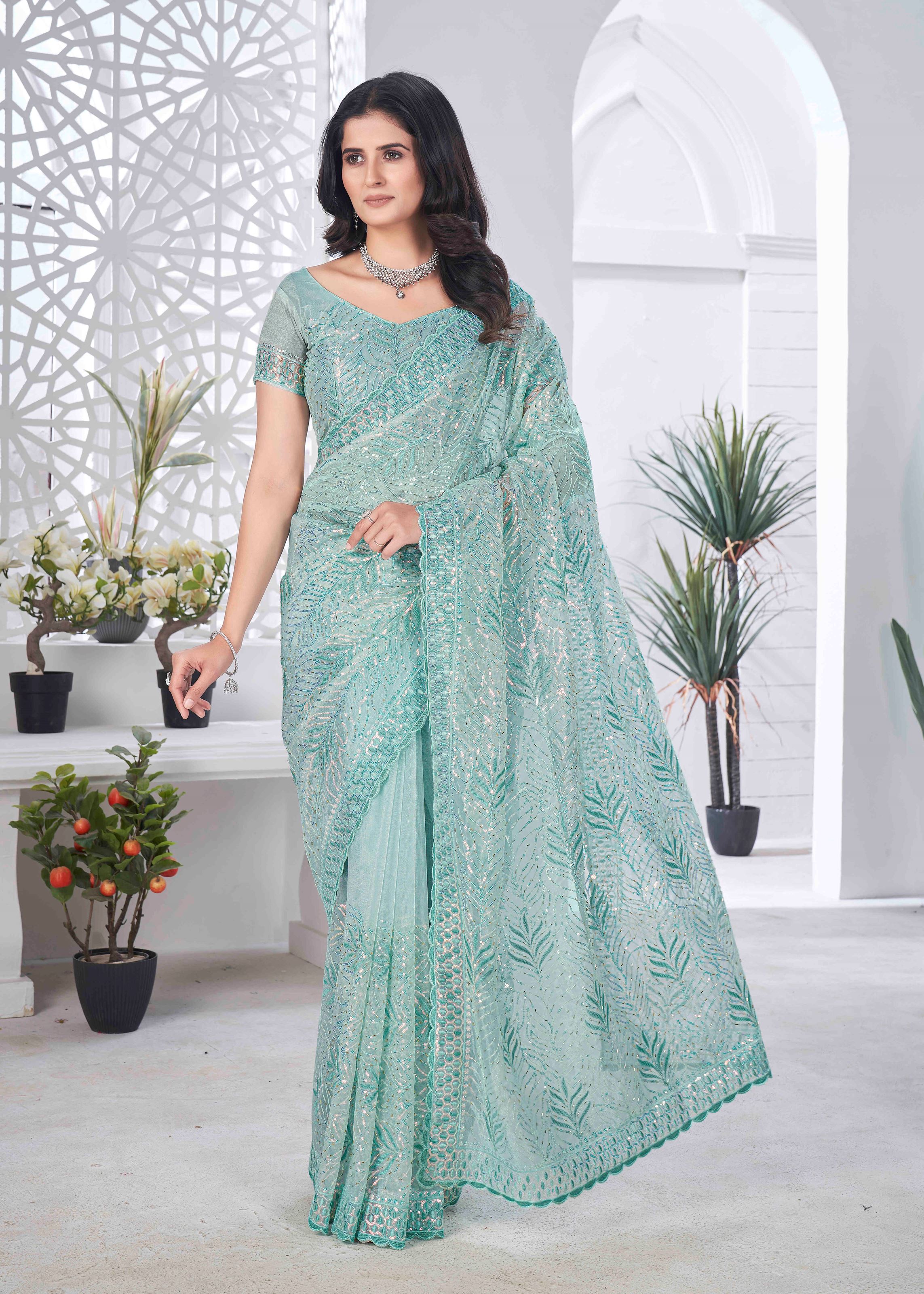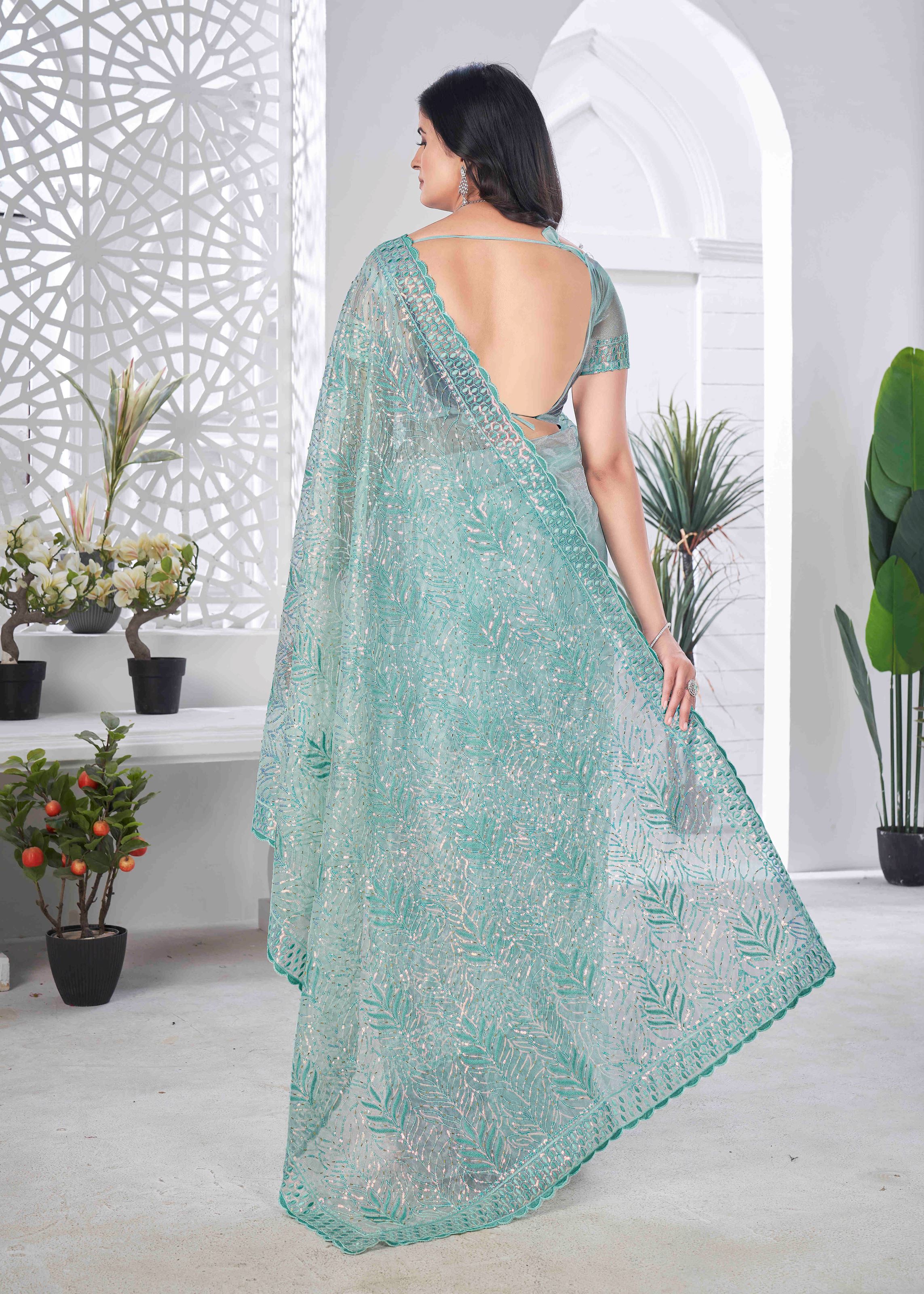 Turn heads at every occasion with this stunning Sea Green Tissue Net Sequence And Multi Thread Embroidery Saree With Cut Work. Designed for those who love to embrace elegance and grace, this saree is perfect for weddings, festive celebrations, and special gatherings.