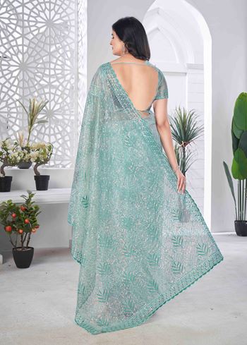 Sea Green Tissue Net Sequance And Multy Thread Embroidery Saree With Cut Work