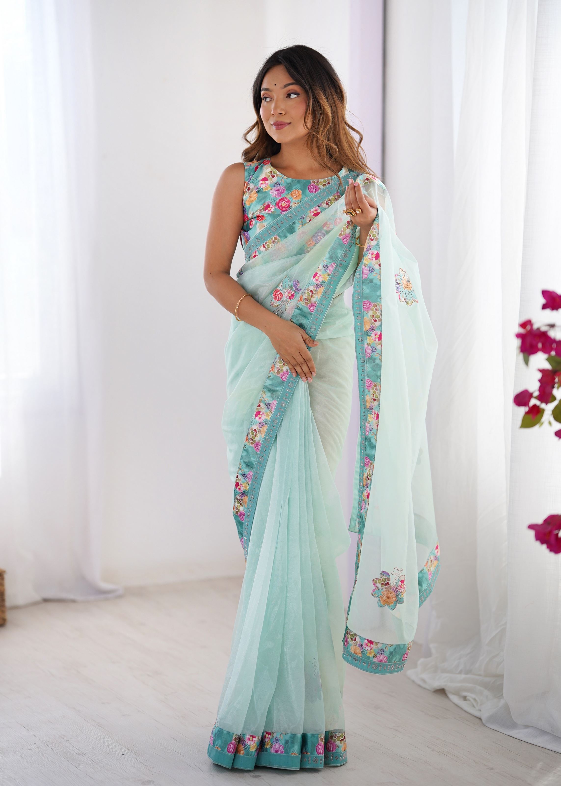 Sea Green Twill Net Designer Printed Swarovski Work Partywear Saree