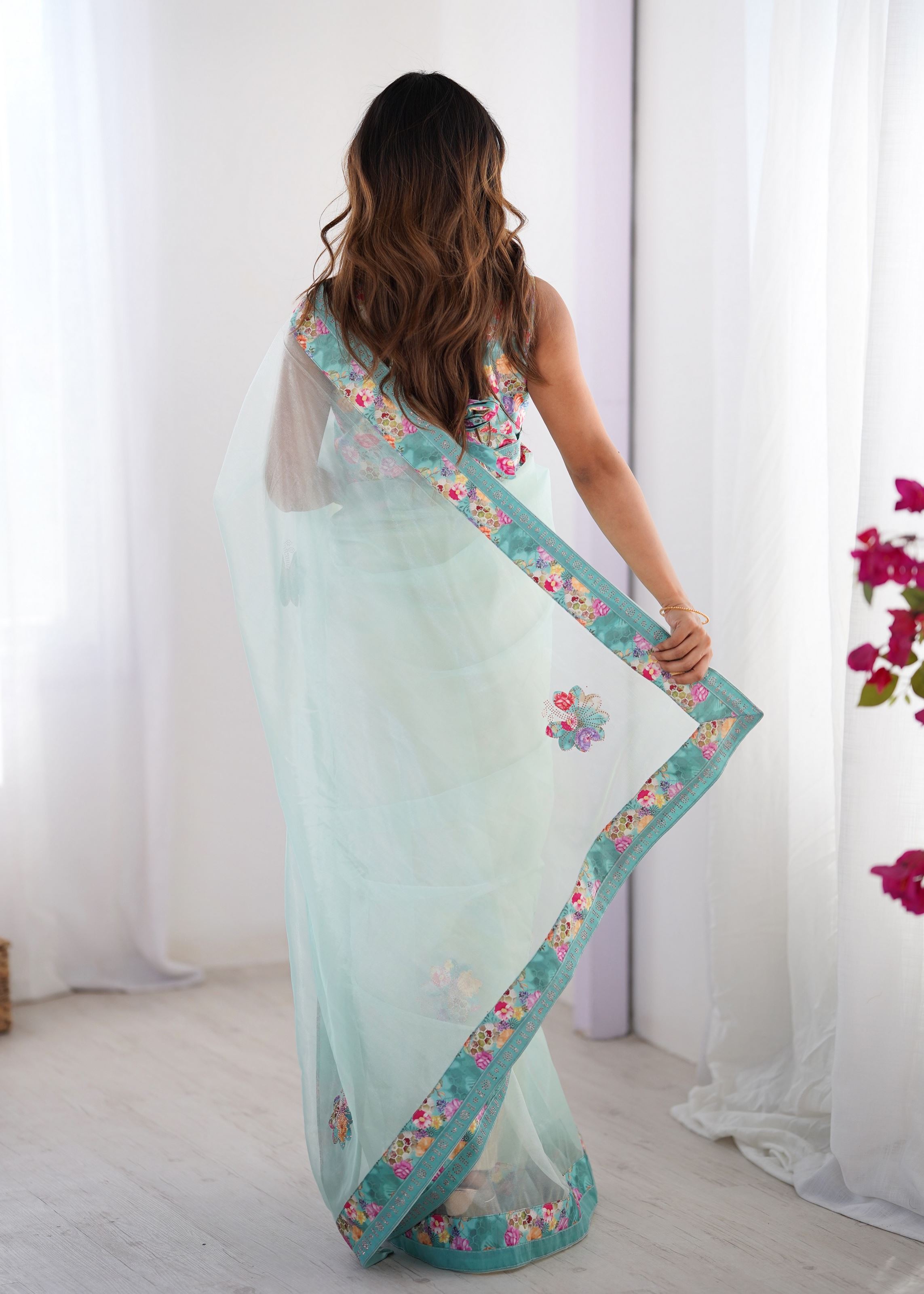 Paired with a contrasting multicolor art silk blouse, the ensemble adds a vibrant twist to the refined sea green base. The rich texture of the blouse blends seamlessly with the saree, enhancing its designer appeal and making it a versatile outfit suitable for both day and evening functions.Style this saree with statement jewelry, delicate heels, and a stylish clutch to complete the look. Perfect for parties, receptions, and festive occasions, this Sea Green Swarovski Work Net Saree is designed to make every moment memorable.