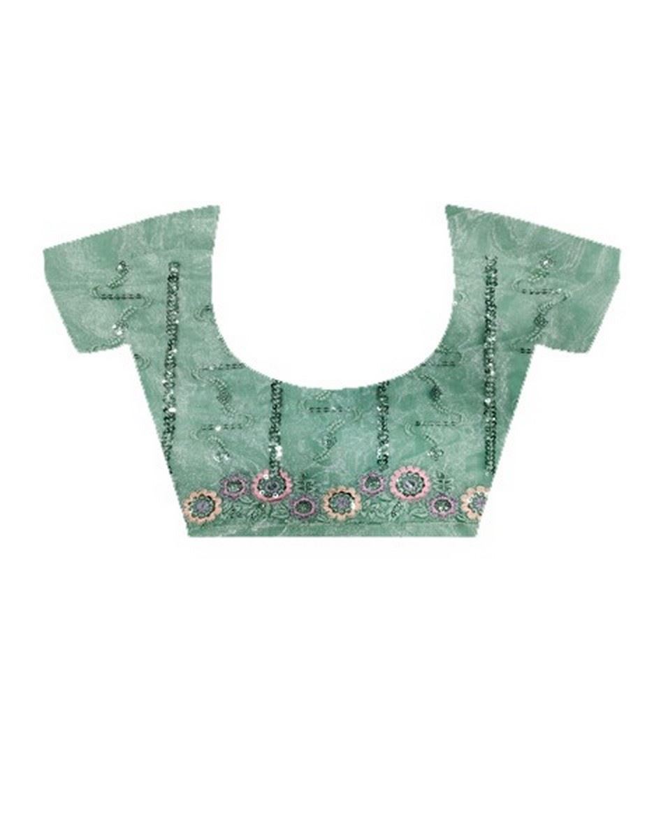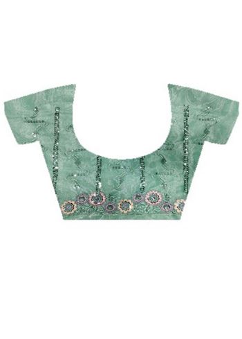 Accompanied by a matching sea green net blouse, this ensemble highlights sophistication and modern flair. The lightweight fabric ensures comfort, making it easy to drape and carry throughout long occasions. Whether you style it with minimal jewelry for subtle elegance or bold accessories for a glamorous finish, this embroidered saree adapts effortlessly to your unique fashion sense.