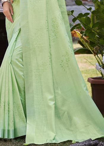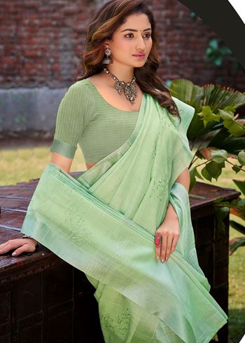 Paired with a matching green linen blouse, this saree ensures a cohesive and stylish look. The soft, breathable fabric guarantees all-day comfort, while the subtle shimmer enhances your presence, making it a must-have for festival season. Whether attending a traditional event or a casual celebration, this saree effortlessly combines timeless charm with contemporary style.
