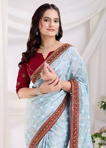 Sky Vichitra silk Saree with Golden Foil bandhani print with embroidery work lace Work