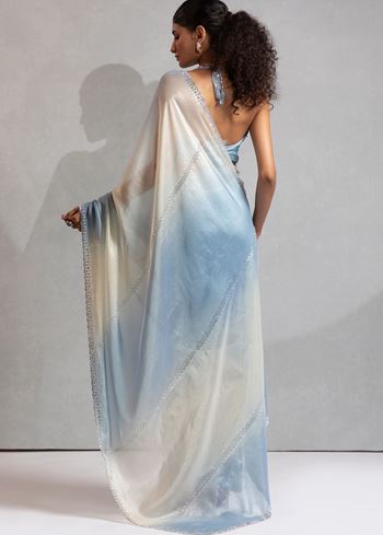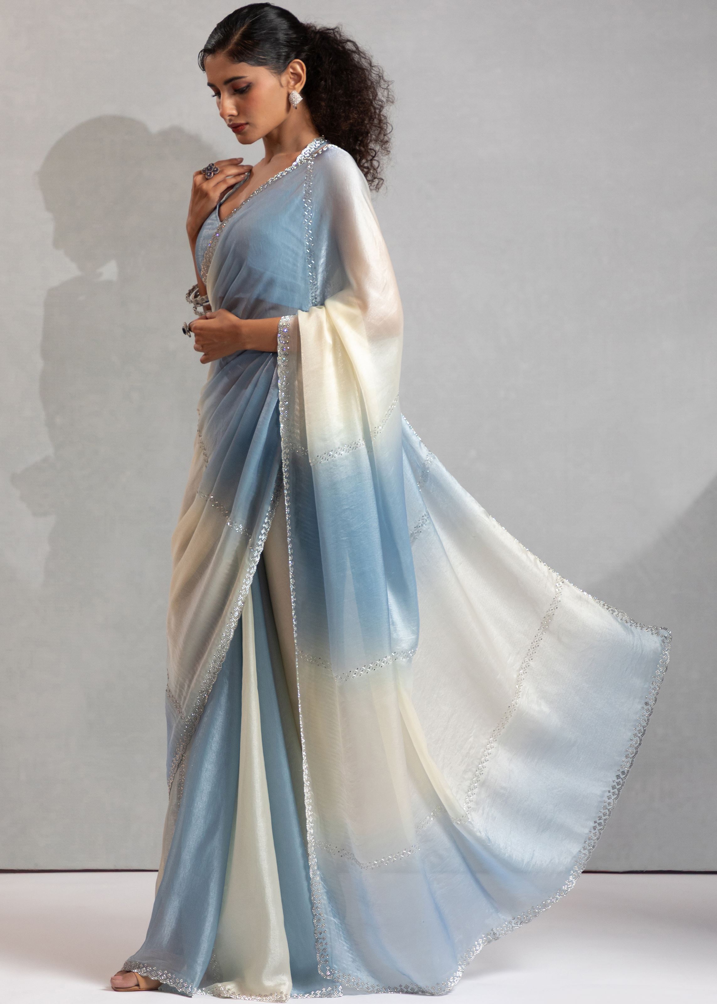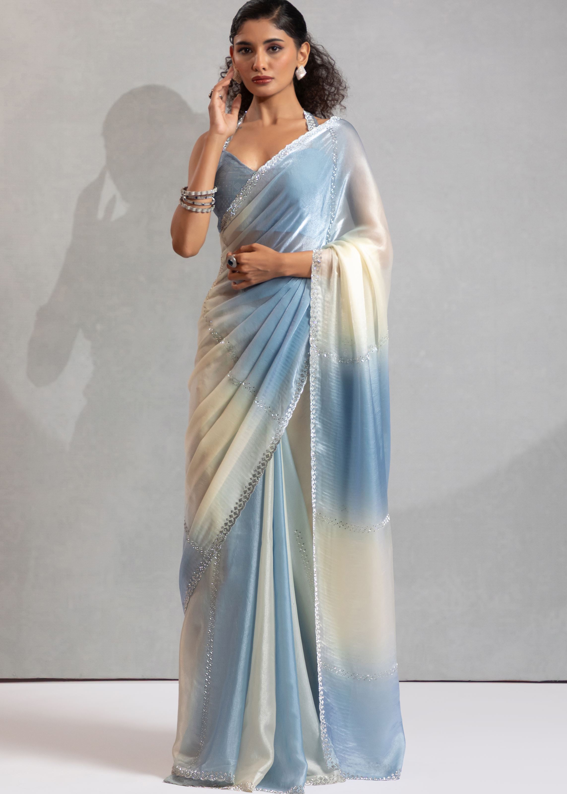 Sky Blue and Cream Satin Saree with Hand Work and Beaded Border