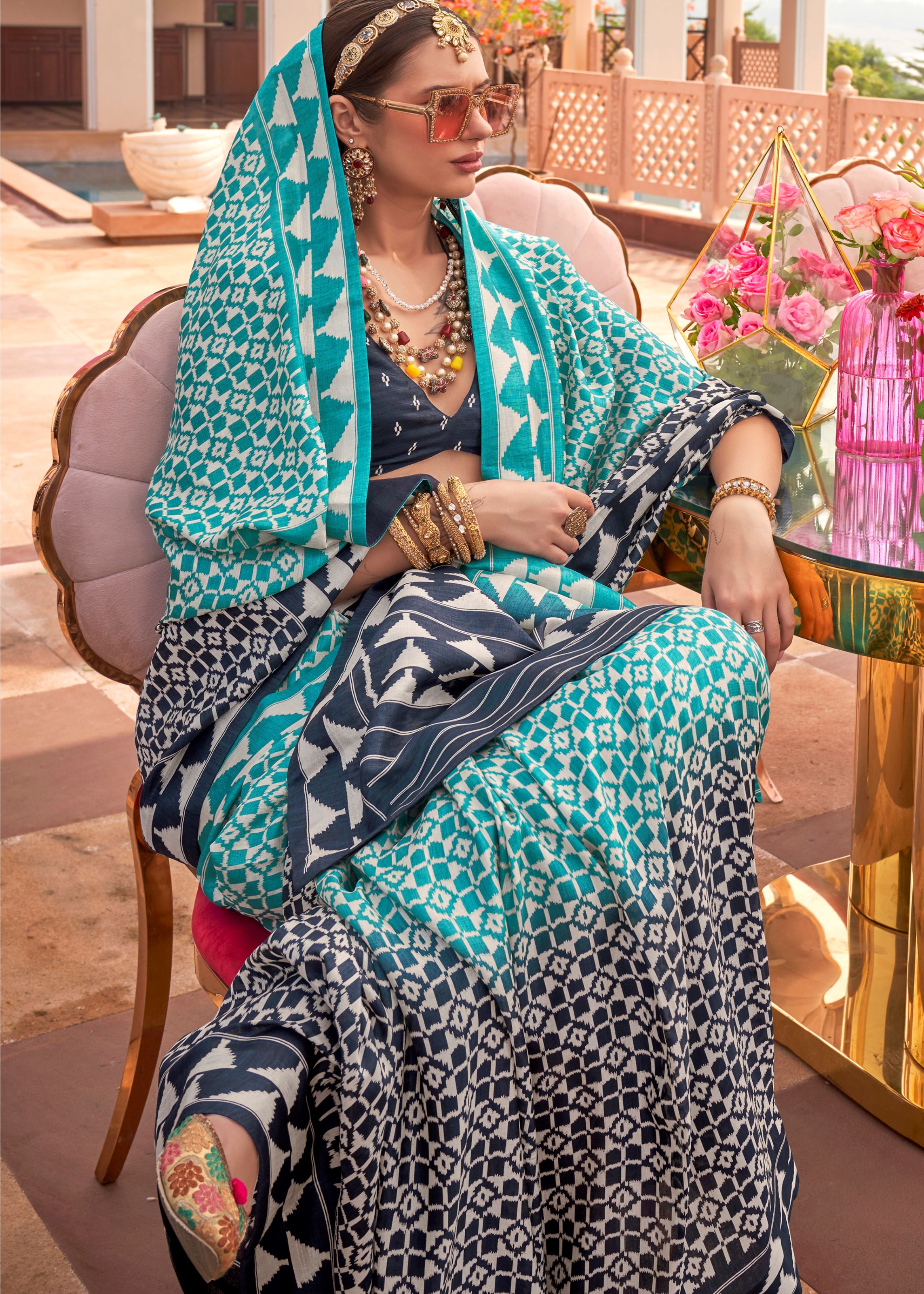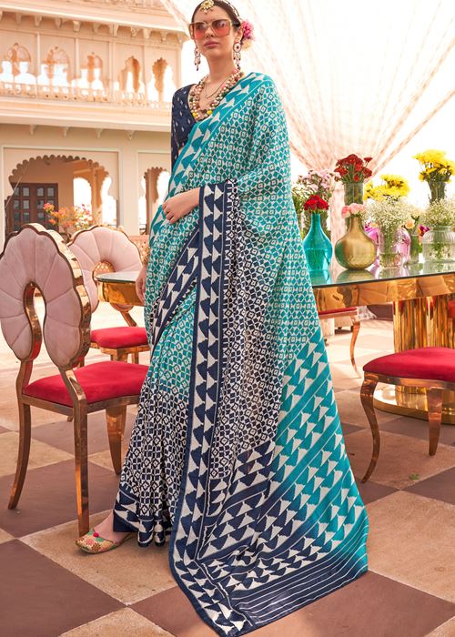 Sky Blue and Navy Blue Silk Saree With Patola Print