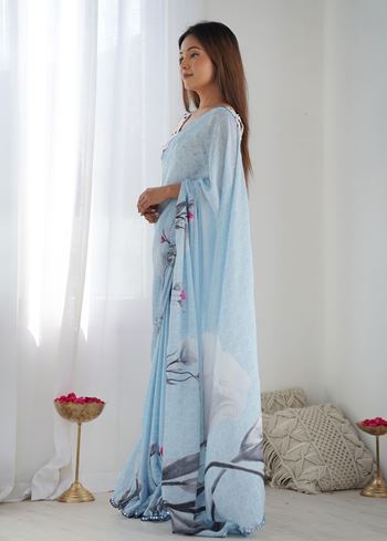 Sky Blue Beautiful Chiffon Fabric Digital Printed Saree With Mirror Cut Work