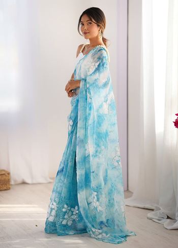 Embrace elegance with this Sky Blue Jimmy Choo Ethnic Saree, designed for the modern woman who loves timeless grace with a hint of glamour. Crafted from premium chiffon fabric, the saree offers a soft, lightweight drape, ensuring both comfort and effortless sophistication.