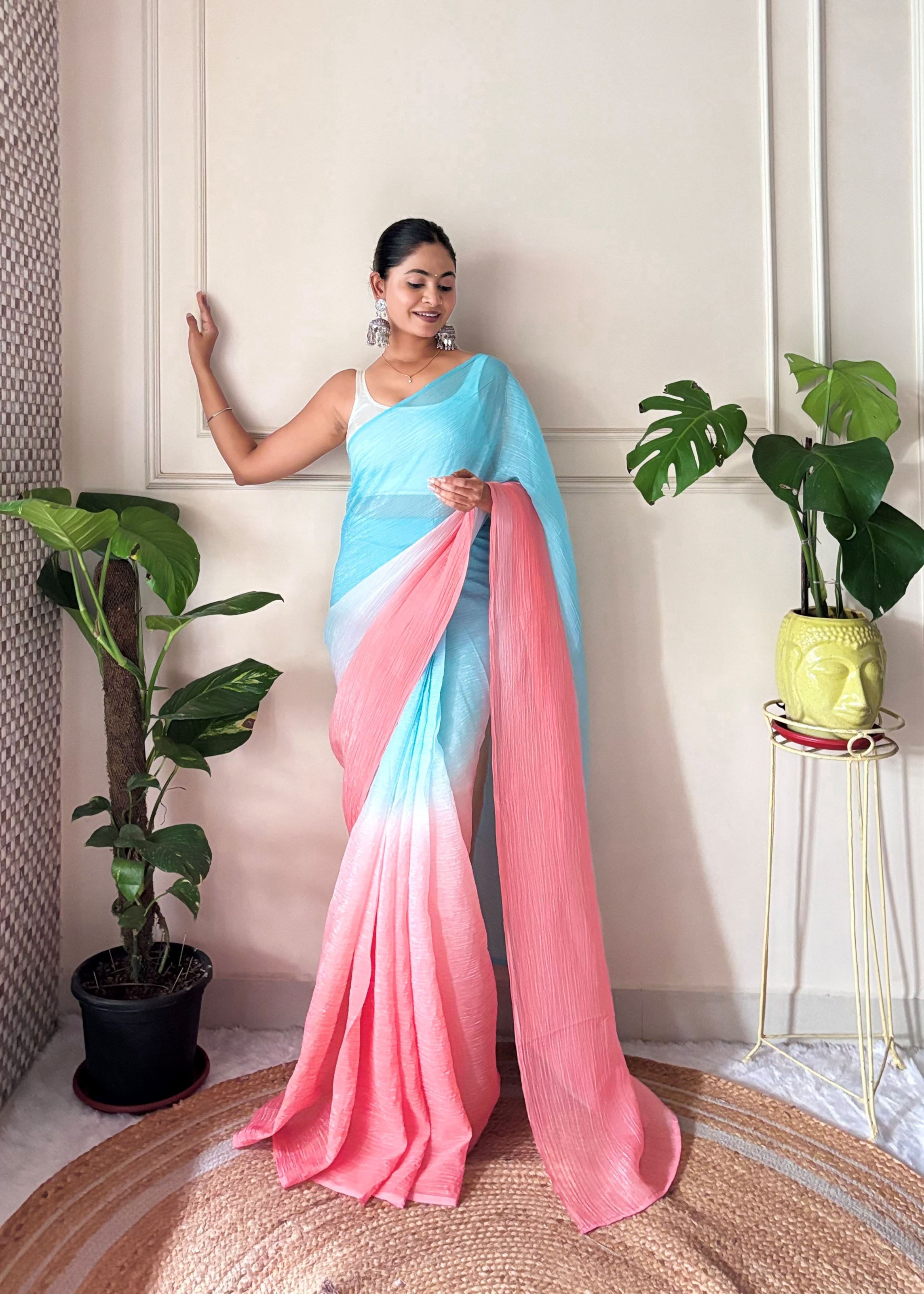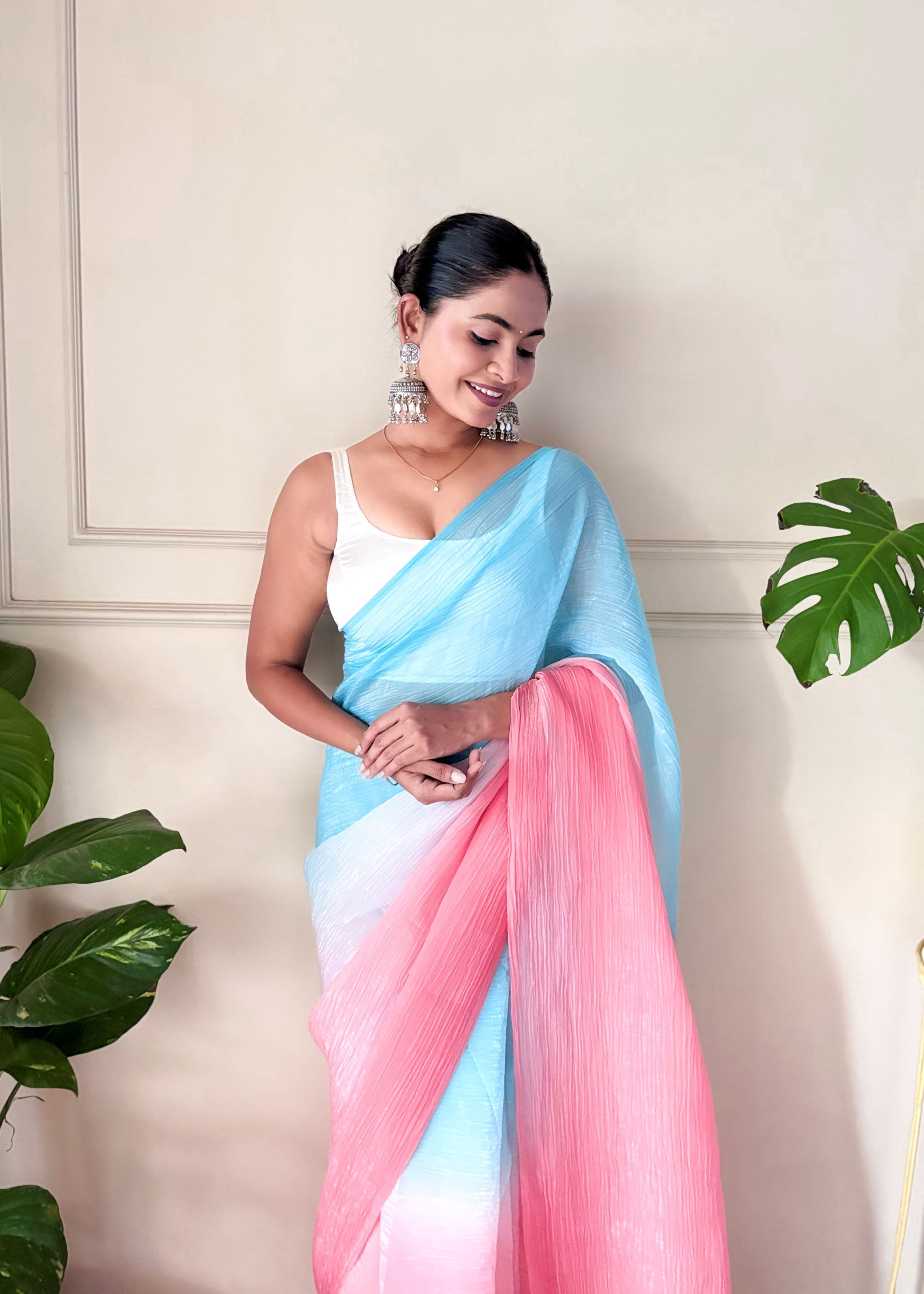 The soothing sky blue shade radiates freshness and charm, making it ideal for festive gatherings, cocktail parties, weddings, or casual celebrations. Its crunchy pedding texture adds a chic, modern twist to traditional draping, giving you a fashionable edge with minimal effort. Designed as a ready-to-wear saree, it saves time without compromising on style.