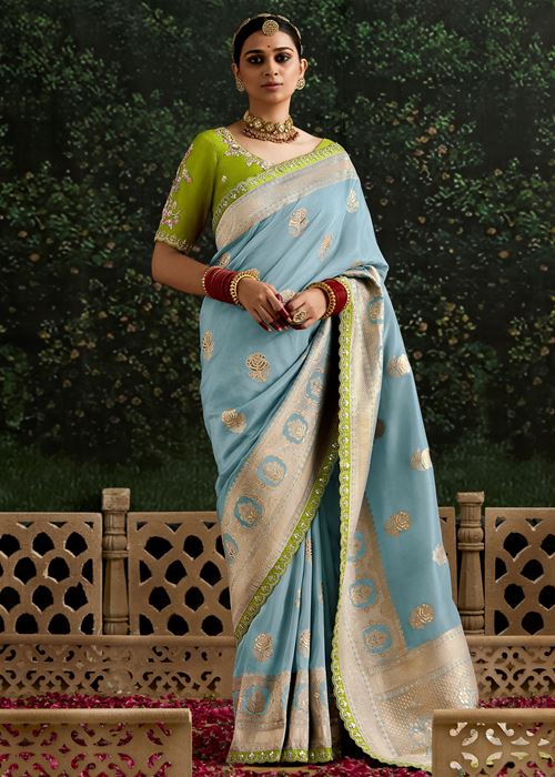 Sky Blue Dola Silk Saree With Jacquard Woven with Embroidered Lace Border