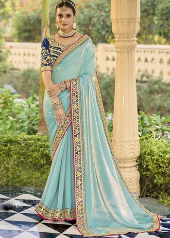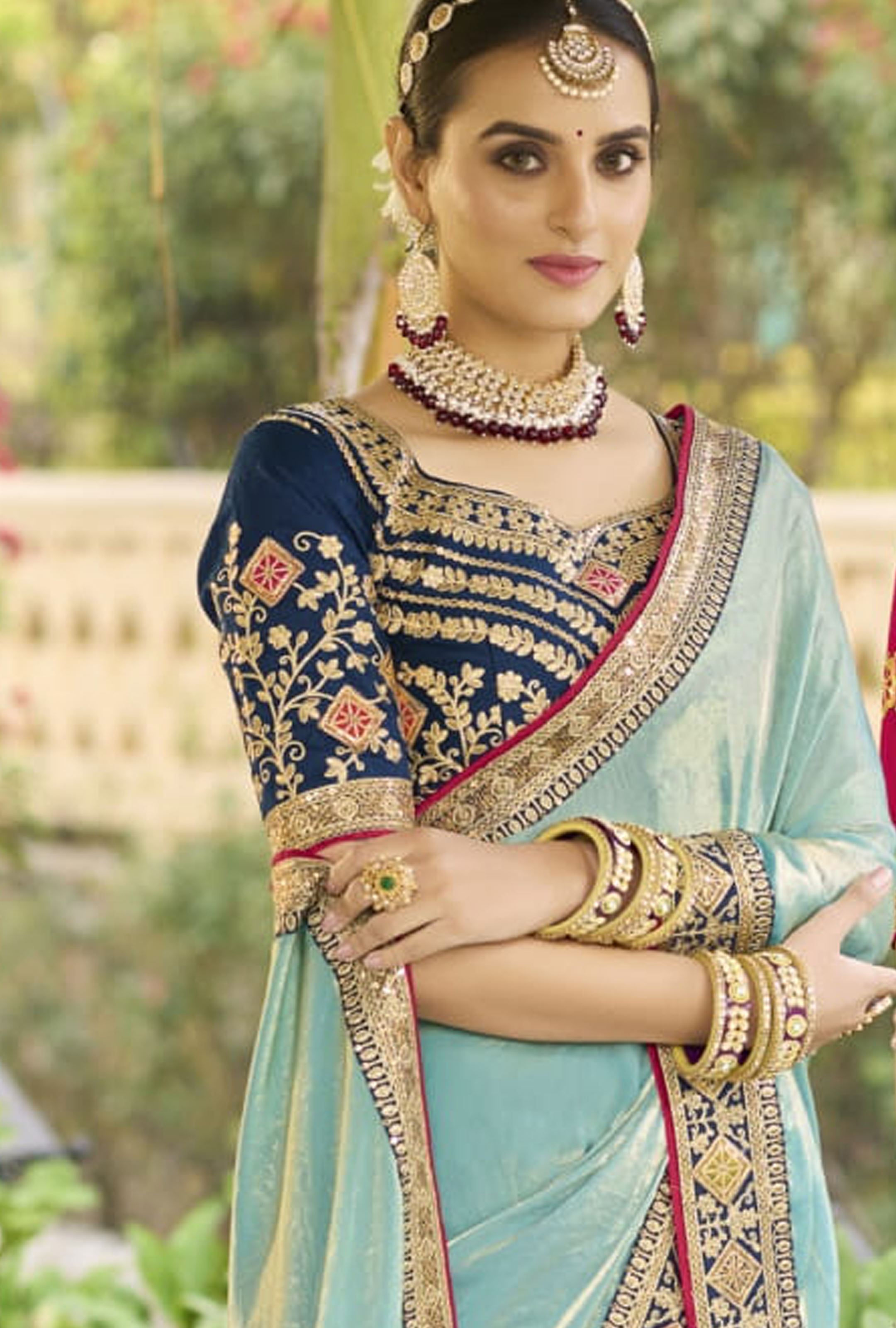 Complementing the airy sky blue is a rich navy blue art silk blouse, adding a dramatic contrast to the ensemble. The blouse fabric in art silk enhances the overall appeal with its subtle sheen and polished finish, making this pairing suitable for formal occasions and festive celebrations alike.