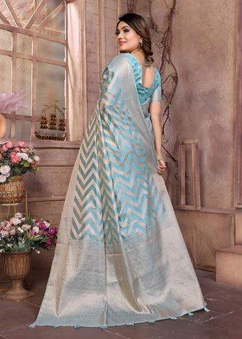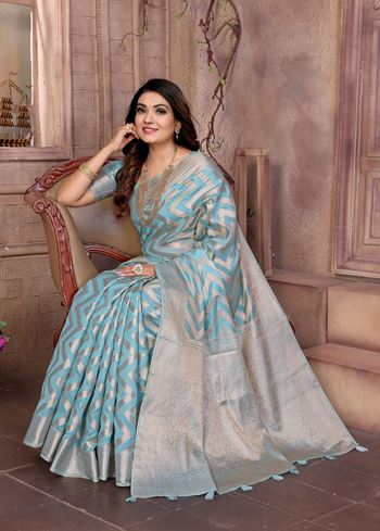 Sky Blue Organza Woven Jari Designer Heavy Ceremonial Saree