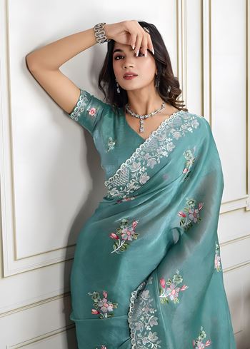 The fabric is known for its crisp yet soft drape, offering structure while remaining lightweight and breathable. This saree is adorned with eye-catching digital prints that give it a modern appeal, while subtle thread and sequins embroidery add shimmer and artisanal charm. The running blouse in matching sky blue crunchy silk provides cohesive styling and tailoring flexibility.