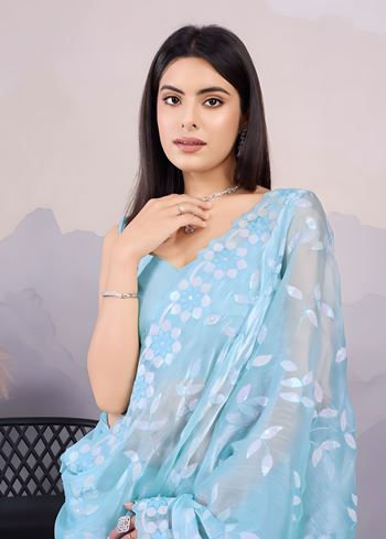 Sky Burberry Silk Saree with C Pallu Embroidery with sequins Work