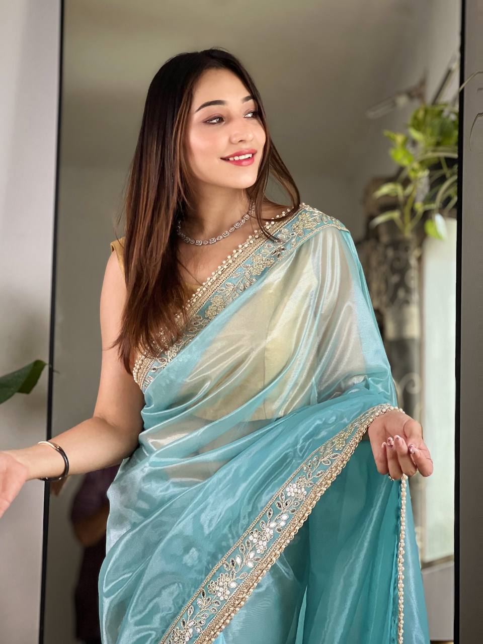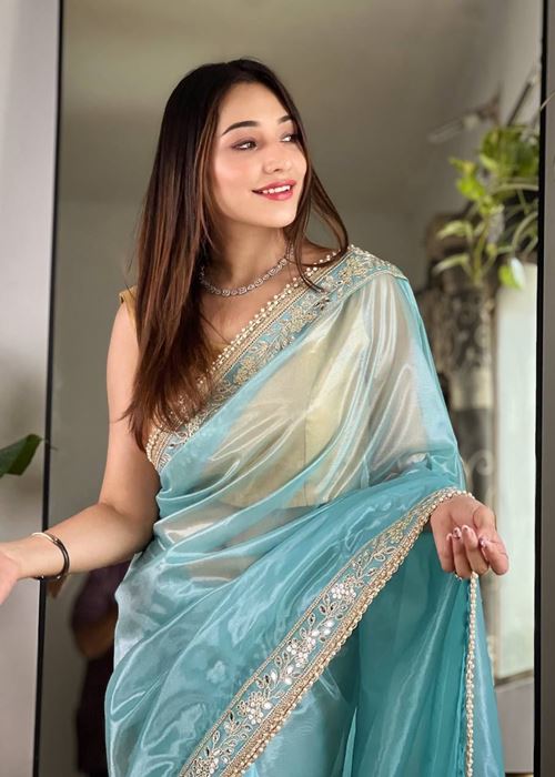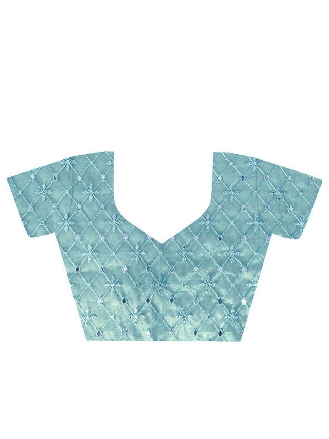 Sky Colour Silver Tissue Silk Embroidery And Mirror Work Saree