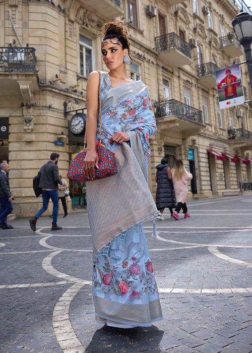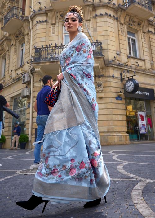 SkyBlue Poly Brasso Handloom Silk Saree With Printed Poly Brasso Handloom Waving