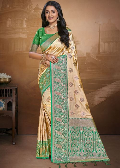 Soft Beige and Tranquil Teal Silk Saree
