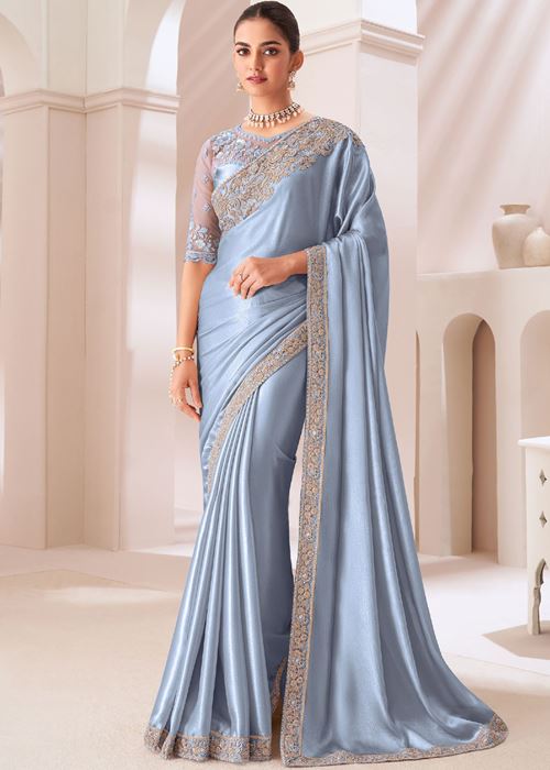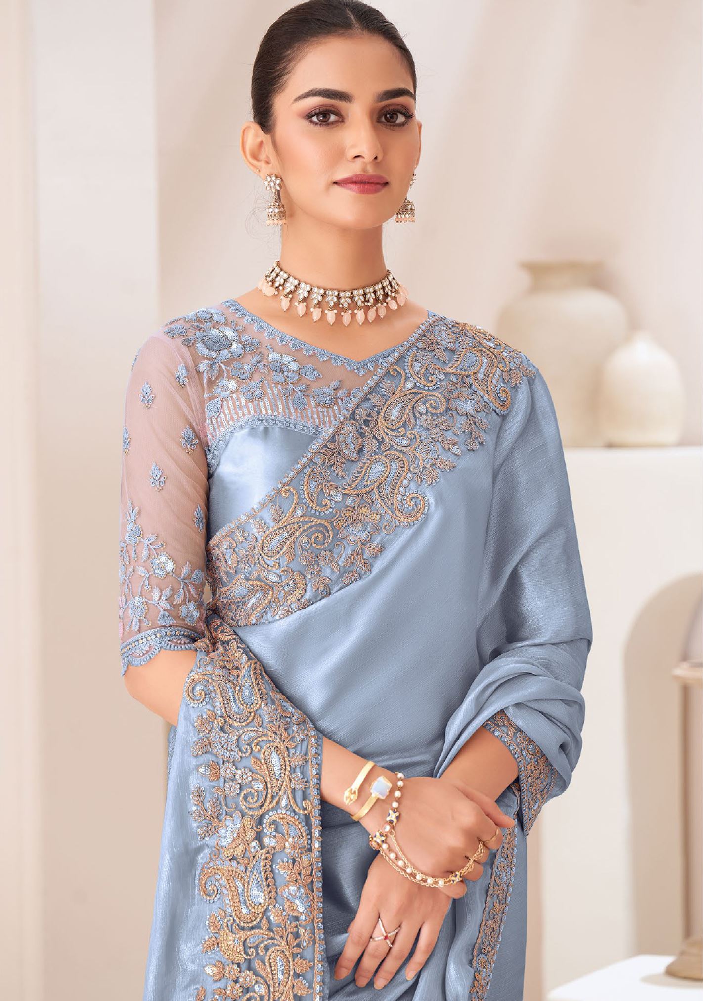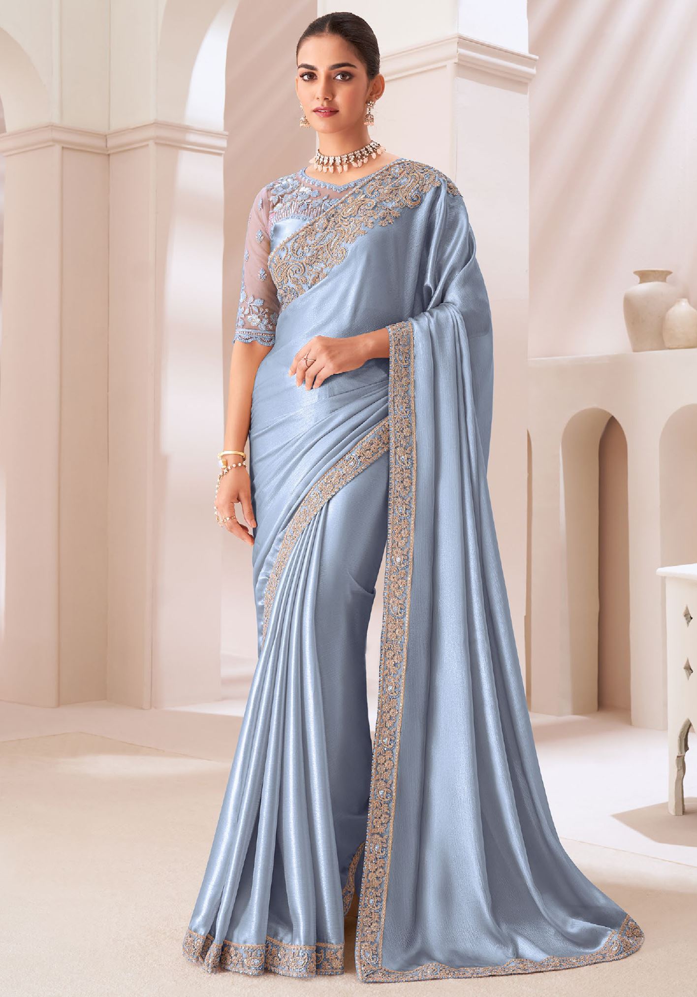 Steel Blue Satin Chiffon Saree With Heavy Thread Embroidery Sequins Work Lace Border Saree With Embroidery Blouse