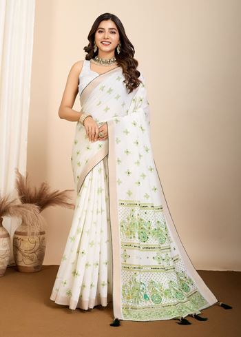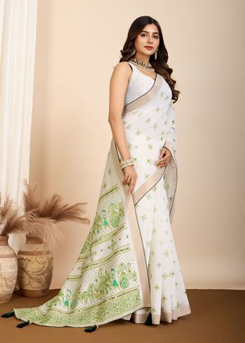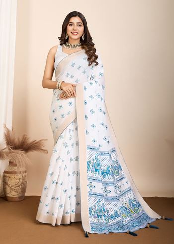 The subtle off-white color lends a refined charm, while the printed handwork design adds a unique artisanal touch that sets this saree apart. Its lightweight texture ensures easy draping, allowing you to carry it gracefully throughout the day. Paired with a matching off-white blended cotton blouse, this saree creates a seamless and elegant look that can be styled with silver or oxidized jewelry for a classic appeal, or with bold accessories for a contemporary vibe.Perfect for festive gatherings, cultural events, or even casual outings, this saree is a true example of traditional craftsmanship blended with modern-day sophistication.
