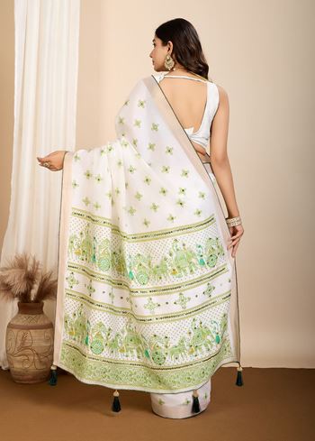 Table Printed Designer Hand Work Off White Blended Coton Saree