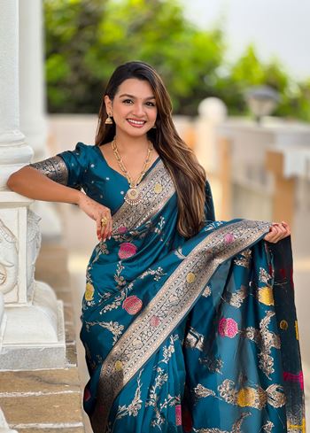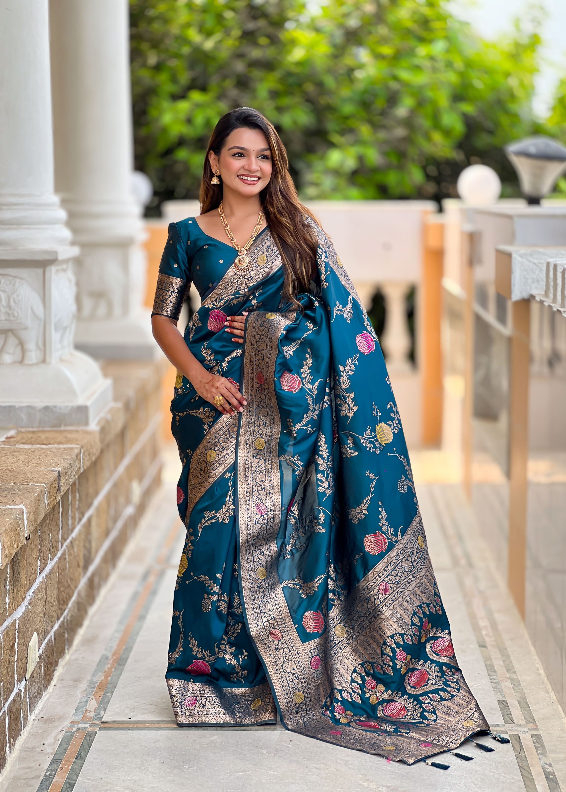 Teal Blue Beautiful Banarasi Silk Woven Meenakari Designer Graceful Ethnic Saree
