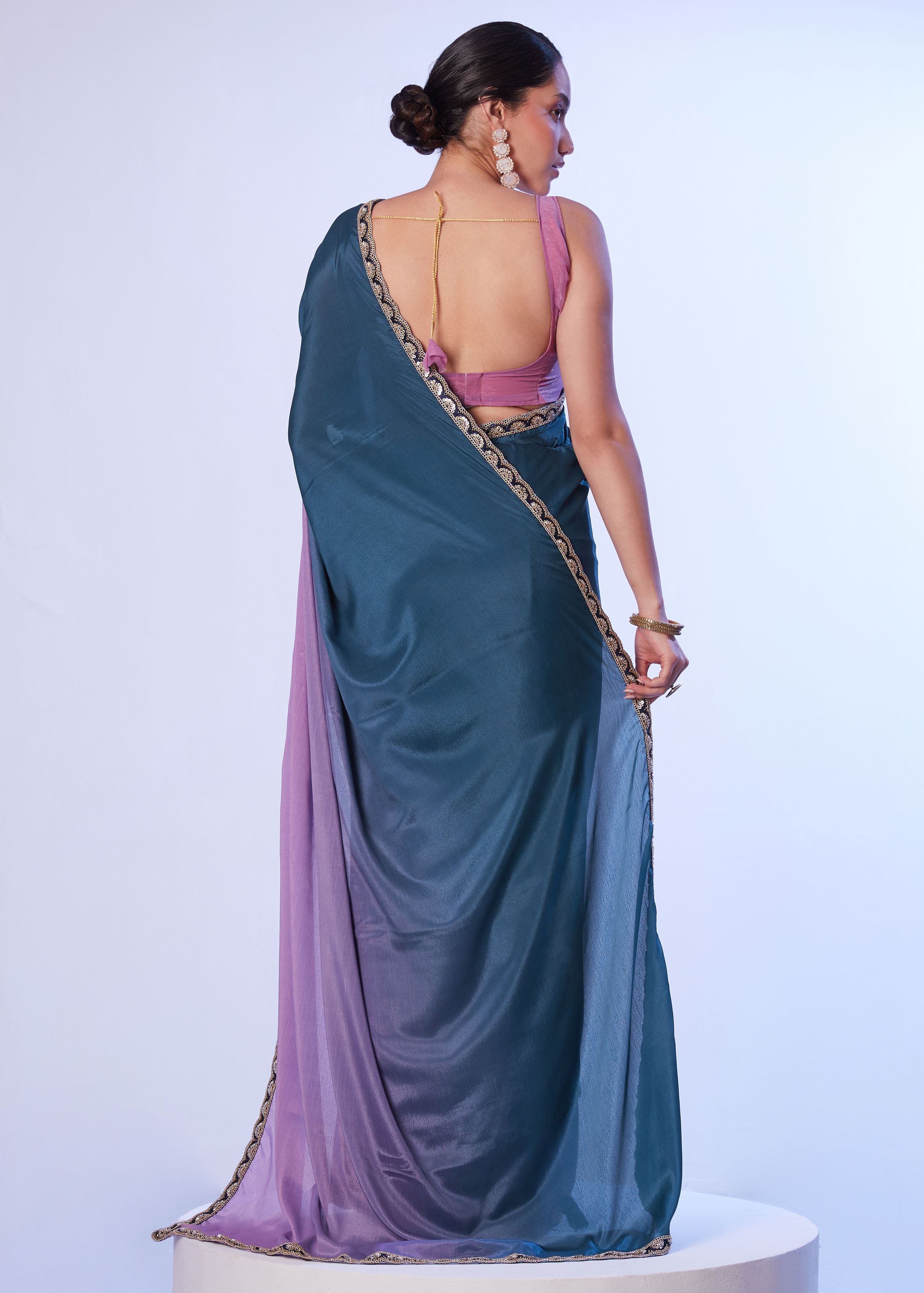 At Aethnofit Fashions, we bring you the latest collection of designer Bollywood sarees online in the USA, with options ranging from chic partywear to luxurious bridal drapes. To enhance your shopping experience, we also offer custom blouse stitching for just $1, ensuring you get a perfect tailored fit every time.Embrace your inner diva with this Teal Blue Chinon Solid Saree, a timeless blend of grace, comfort, and modern Bollywood glamour that promises to make every moment special.