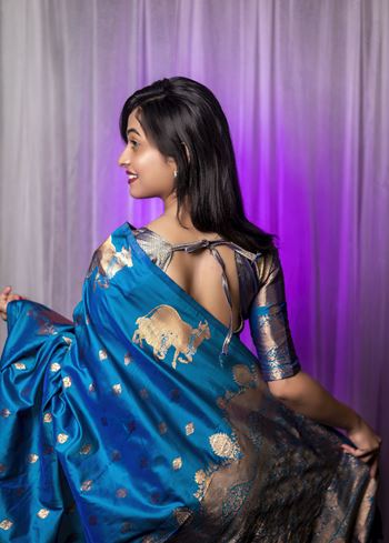 Crafted from premium silk blend fabric, this saree carries the smooth texture and rich sheen of Moonga silk, ensuring comfort with a regal drape. The captivating teal blue hue adds a refreshing yet royal touch, making it a standout choice for grand events. Exquisite woven zari work featuring traditional Nandi-inspired patterns enhances the beauty of this ensemble, showcasing detailed craftsmanship that narrates stories of culture and artistry.