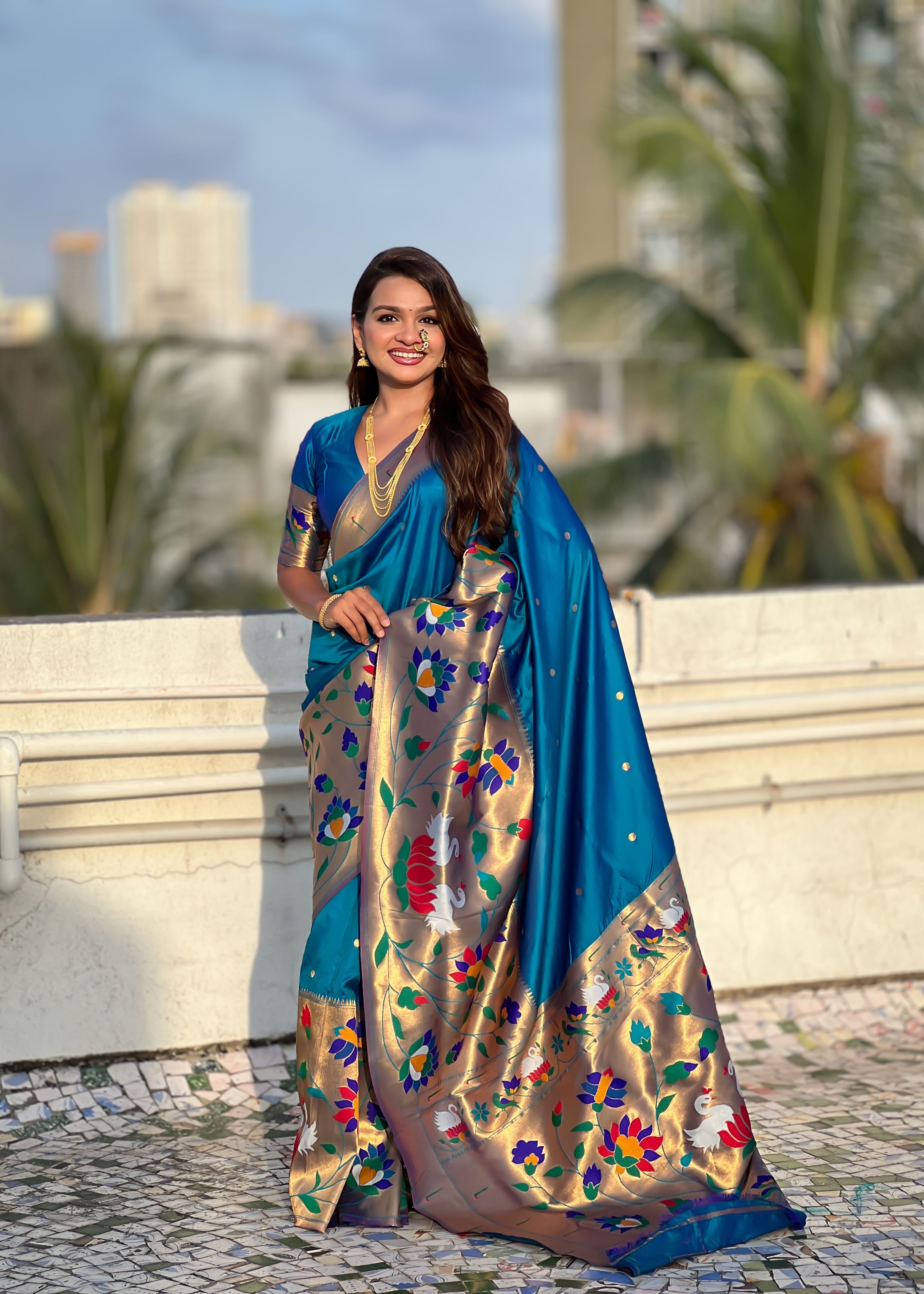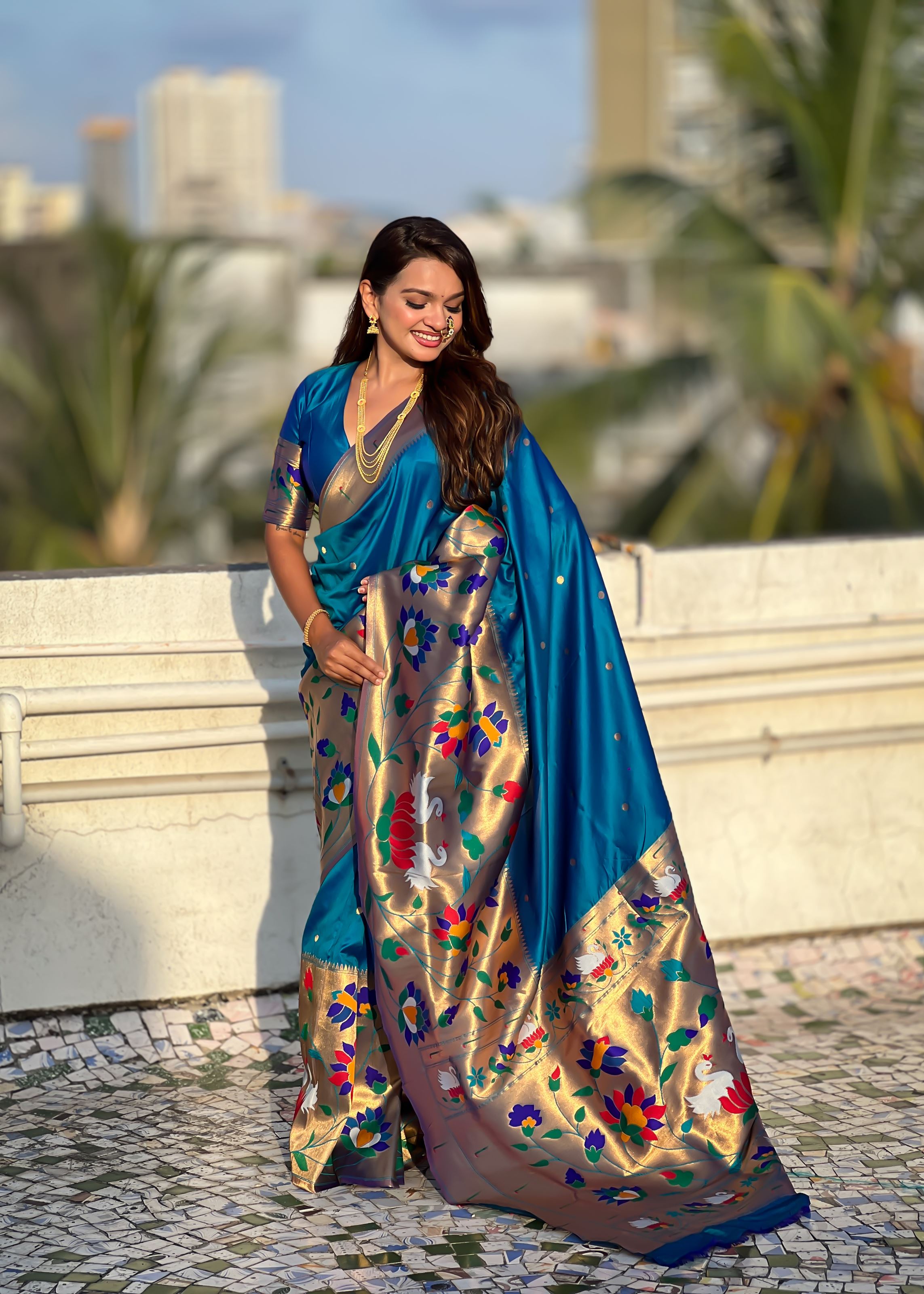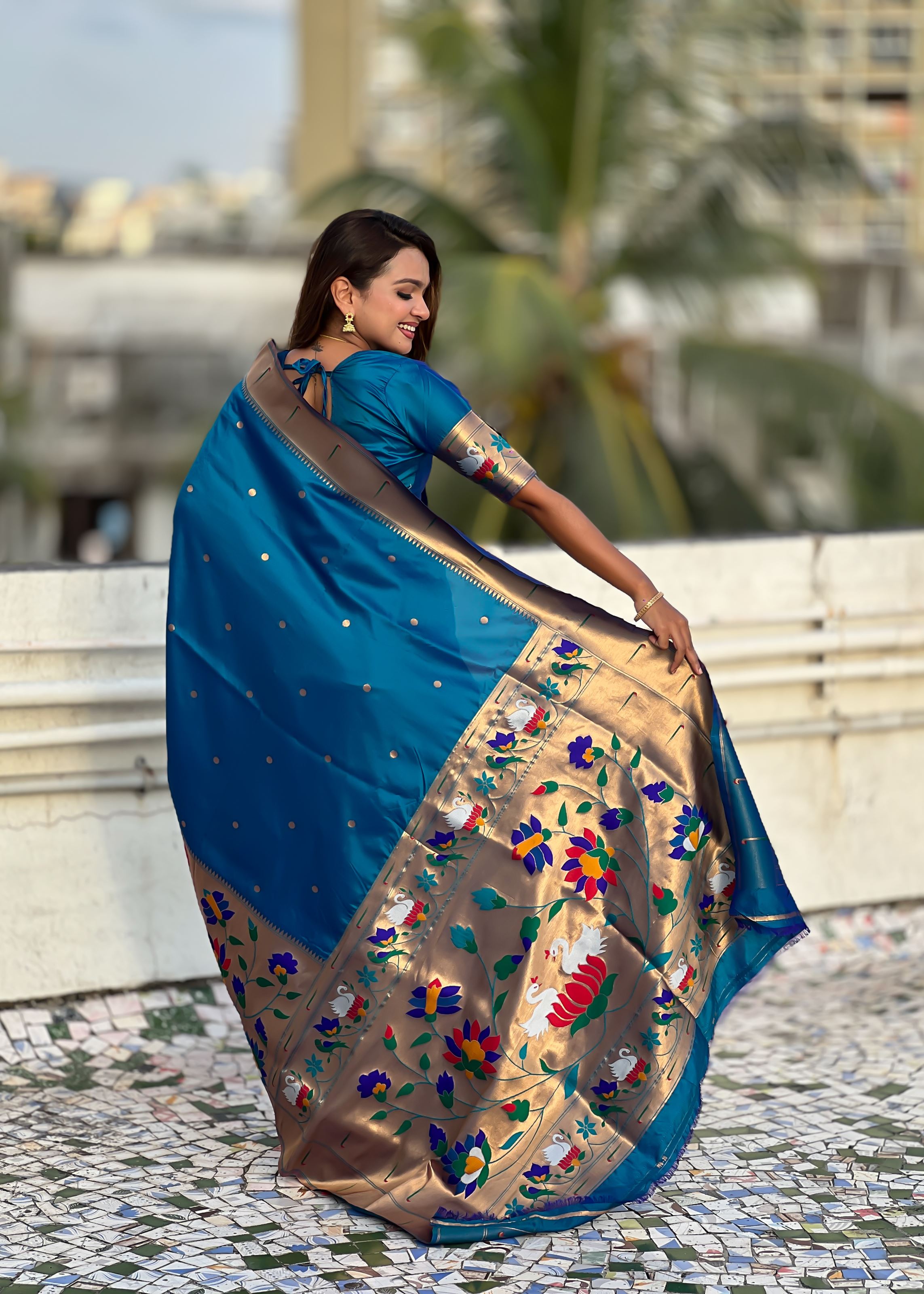 Teal Blue Beautiful Woven Meenakari Polka Designer Paithani Silk Ethnic Graceful Saree