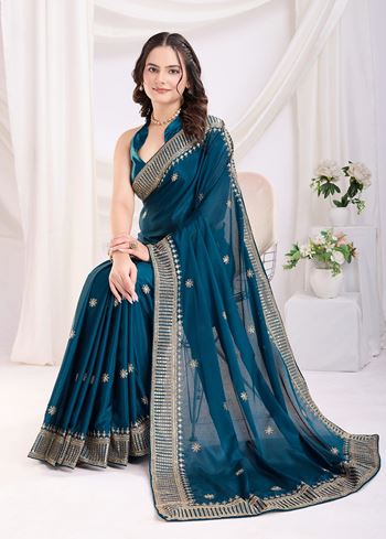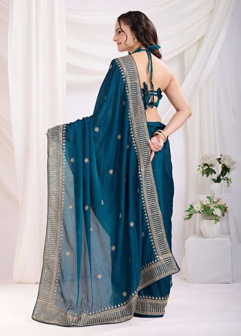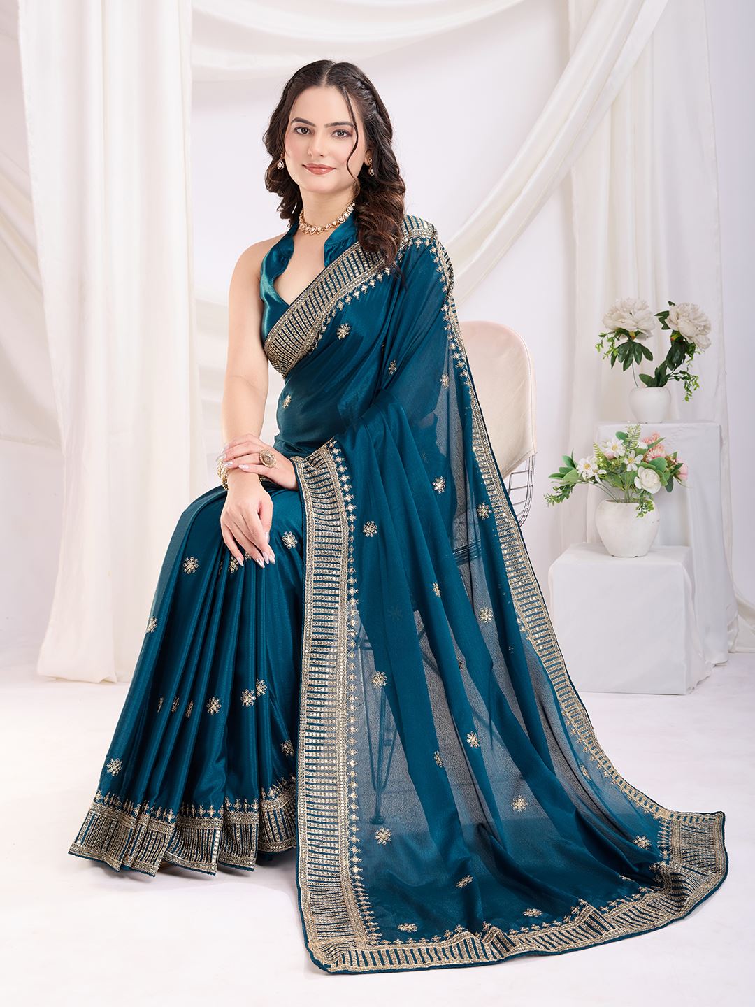 Teal Blue Chinon Silk Desigenr Zari Embroidered Ceremonial Saree
