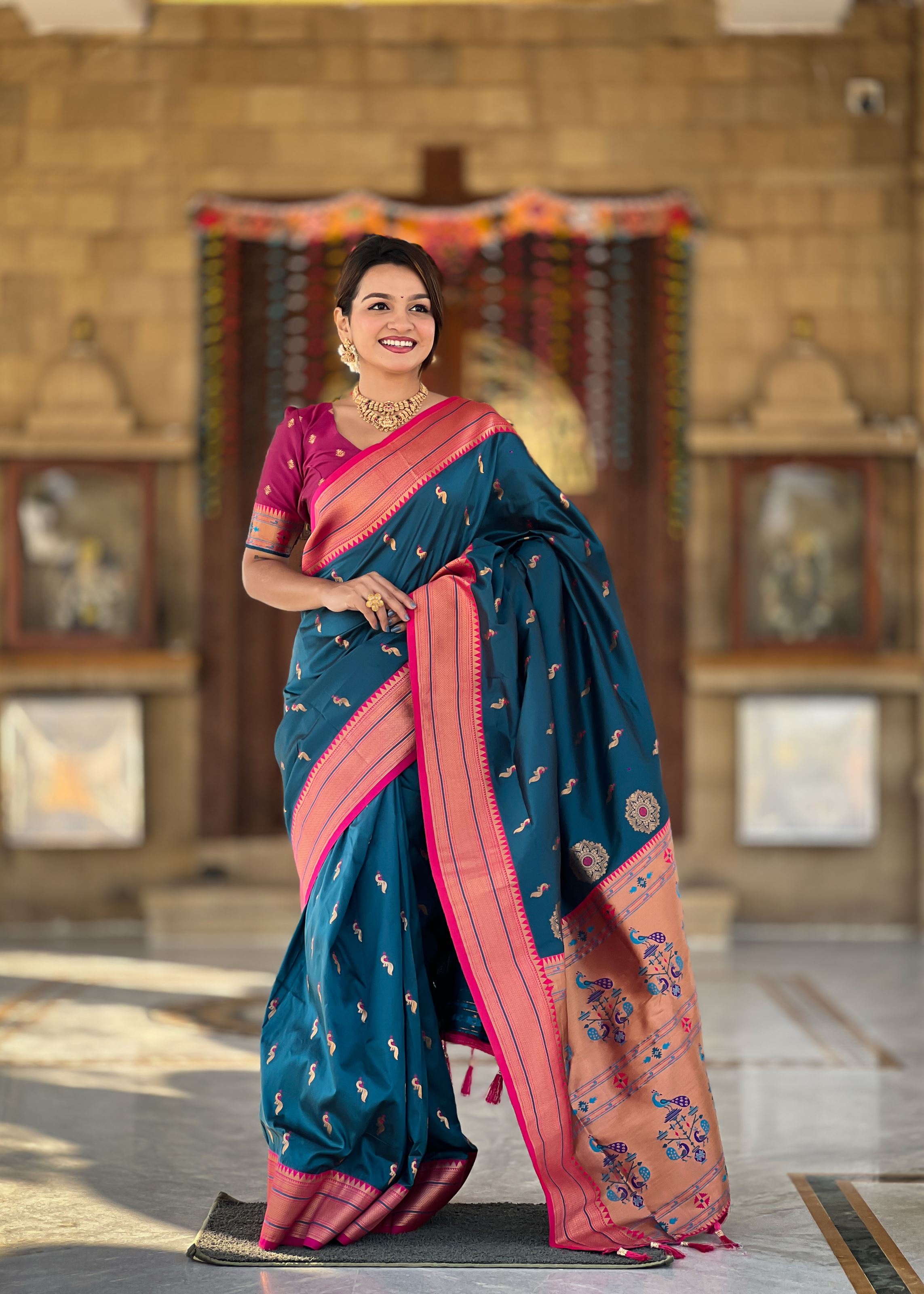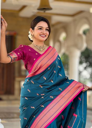 Teal Blue Ethnic Paithani Silk Woven Jacquard Designer Ceremonial Fancy Saree