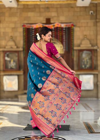 The stunning teal blue hue exudes sophistication, while the intricate woven jacquard work reflects the timeless Paithani artistry. Paired with a beautifully contrasting pink silk blend blouse, it creates a striking yet elegant ensemble that enhances your ethnic appeal.