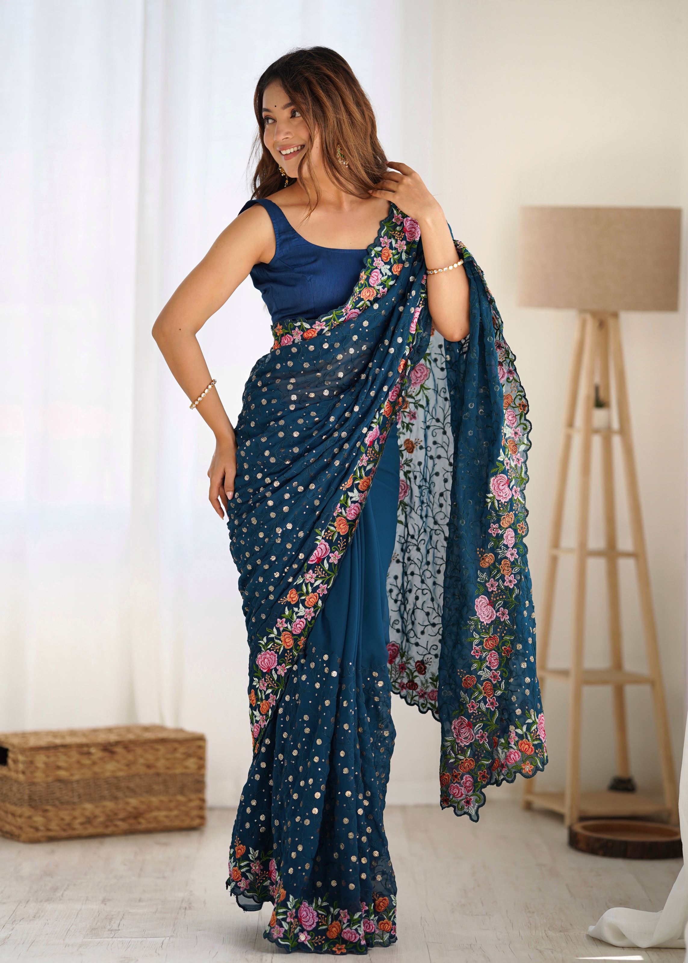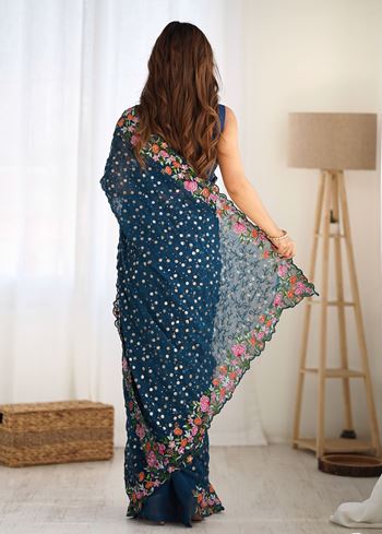 Teal Blue Georgette Fabric Designer Sequins Work Embroidery Saree