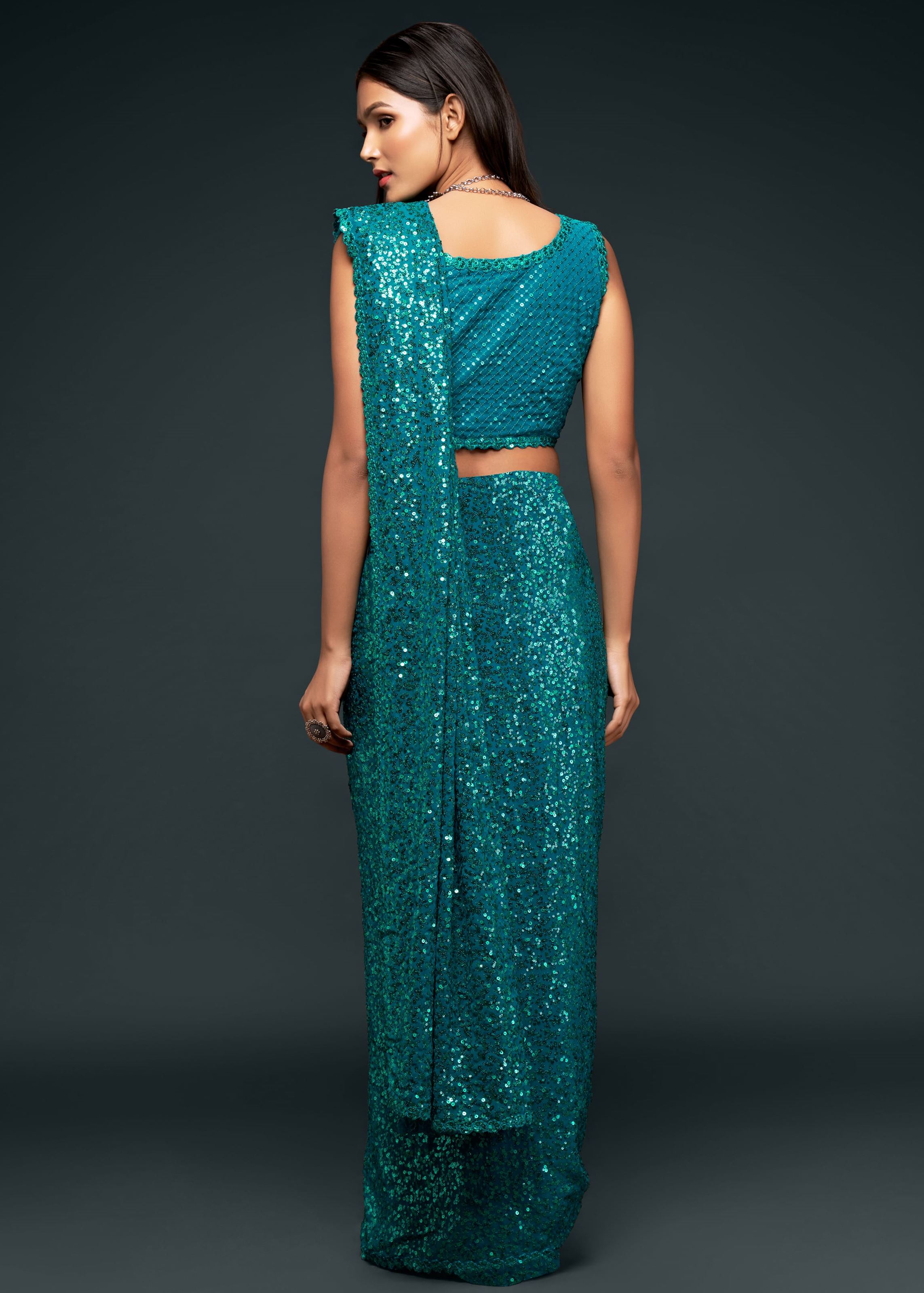 Teal Blue Georgette Saree with Thread Embroidery and Sequins Work