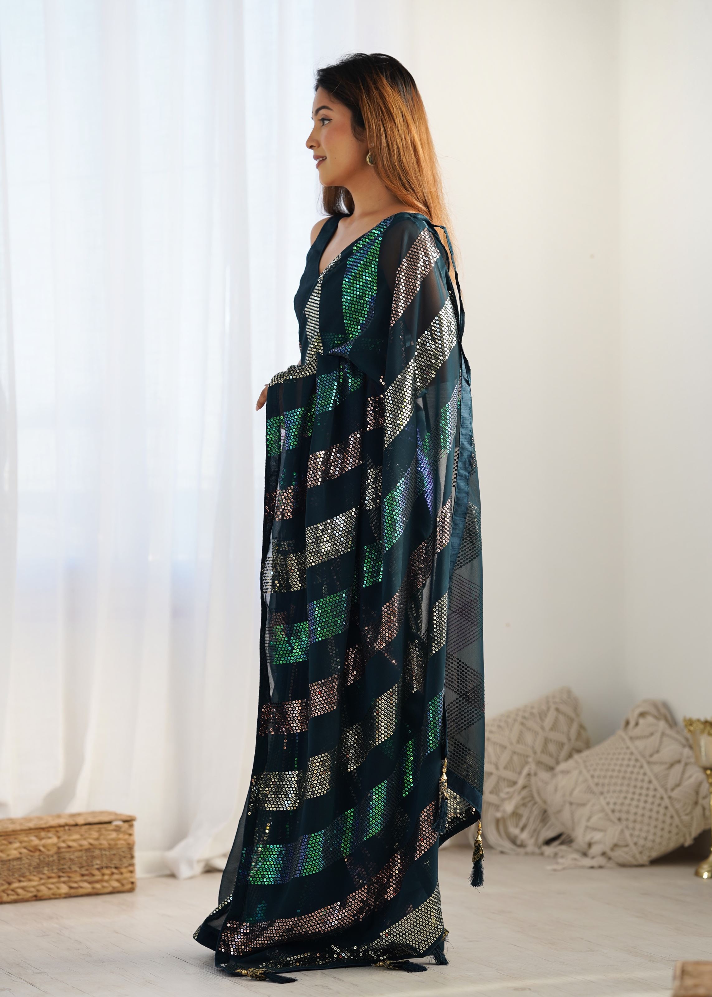 Teal Blue Glamorous Georgette Fabric Sequins Work Bollywood Looks Saree