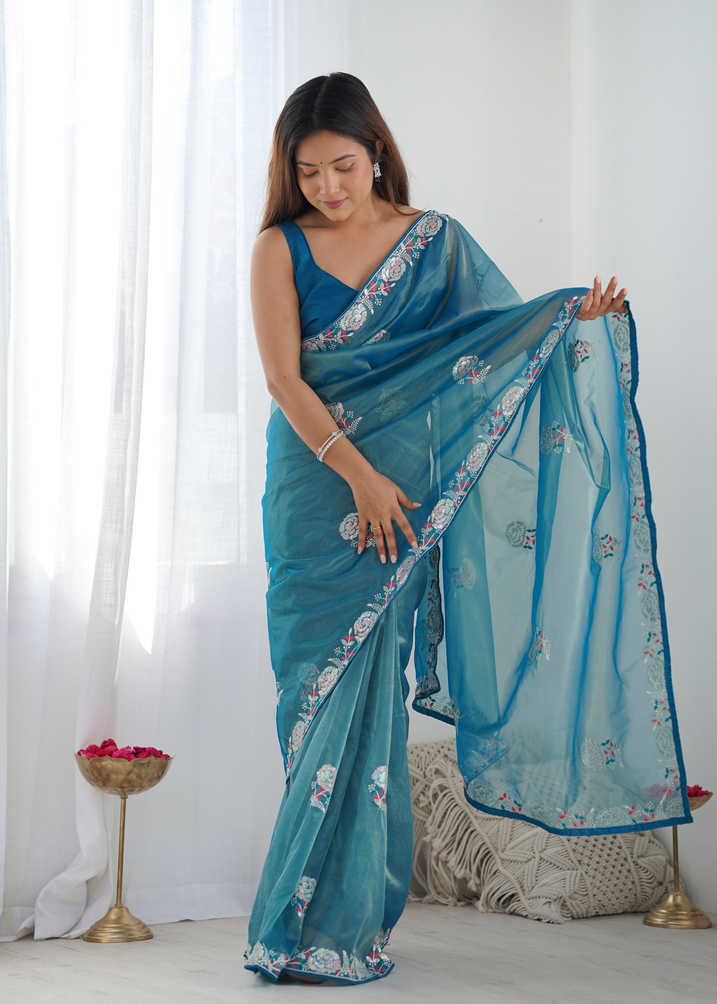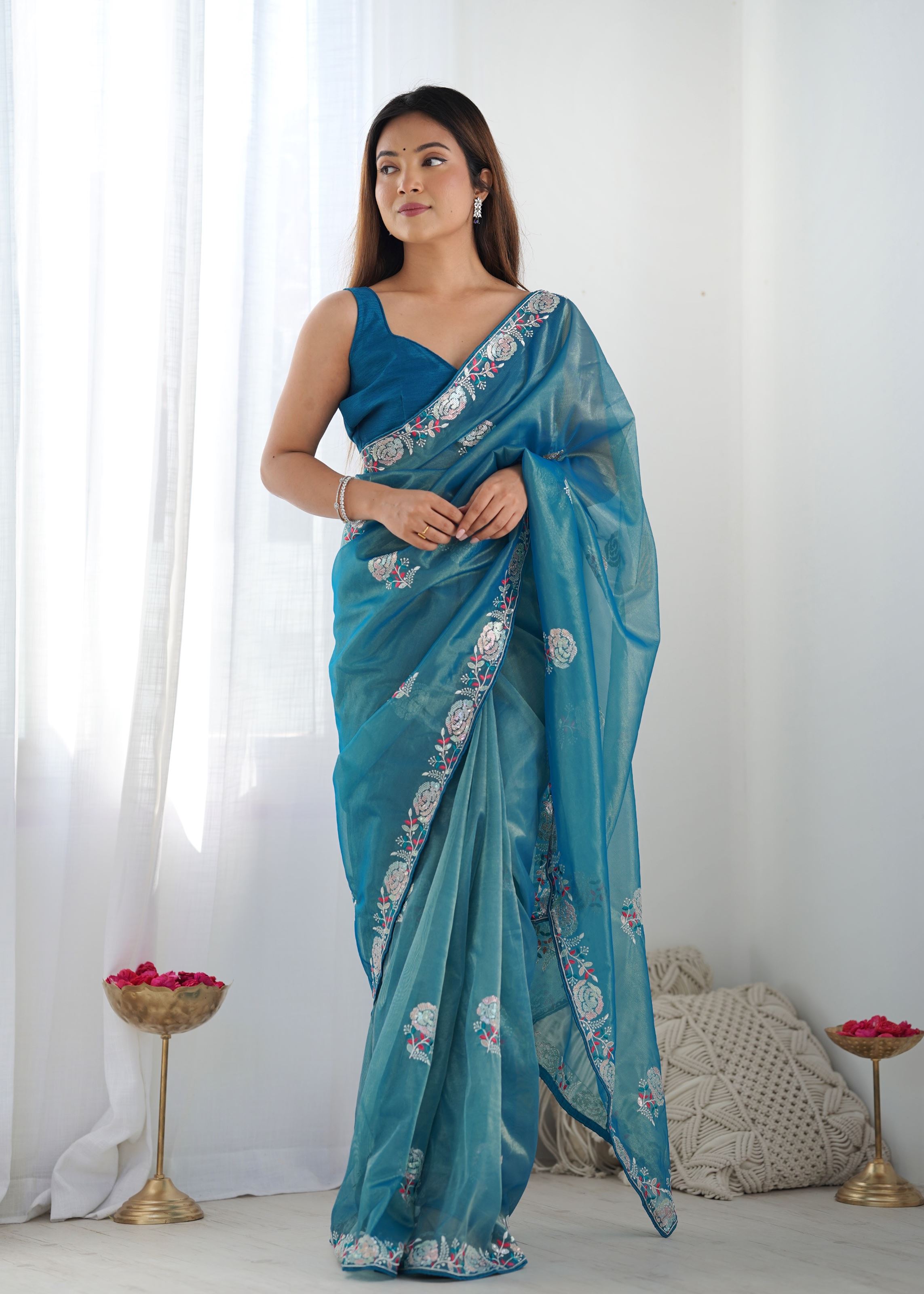 Teal Blue Gold Twill Net Fancy Partywear Embroidered Saree