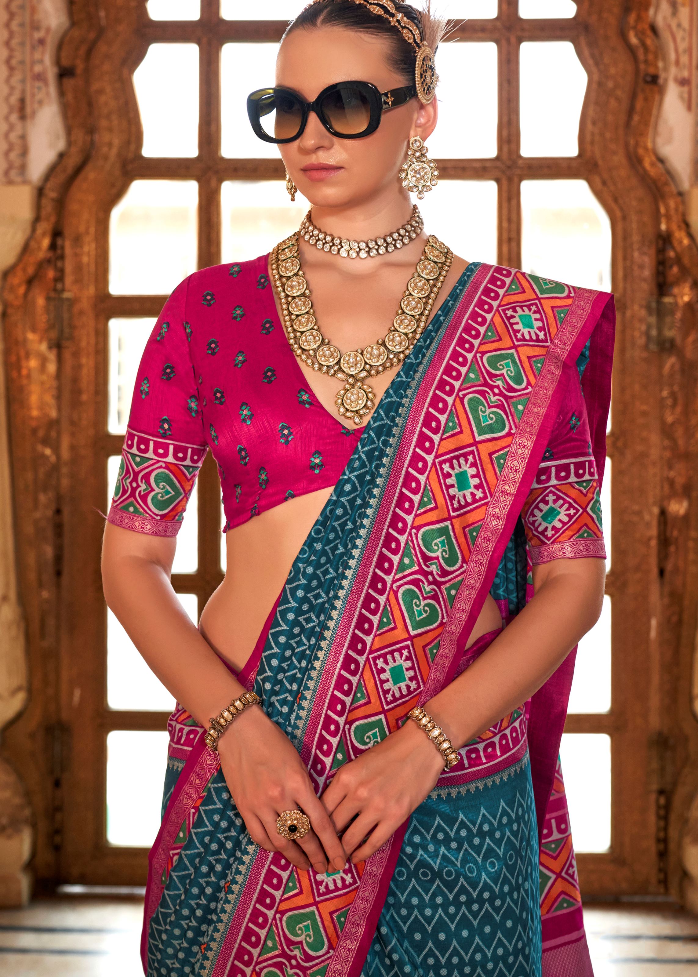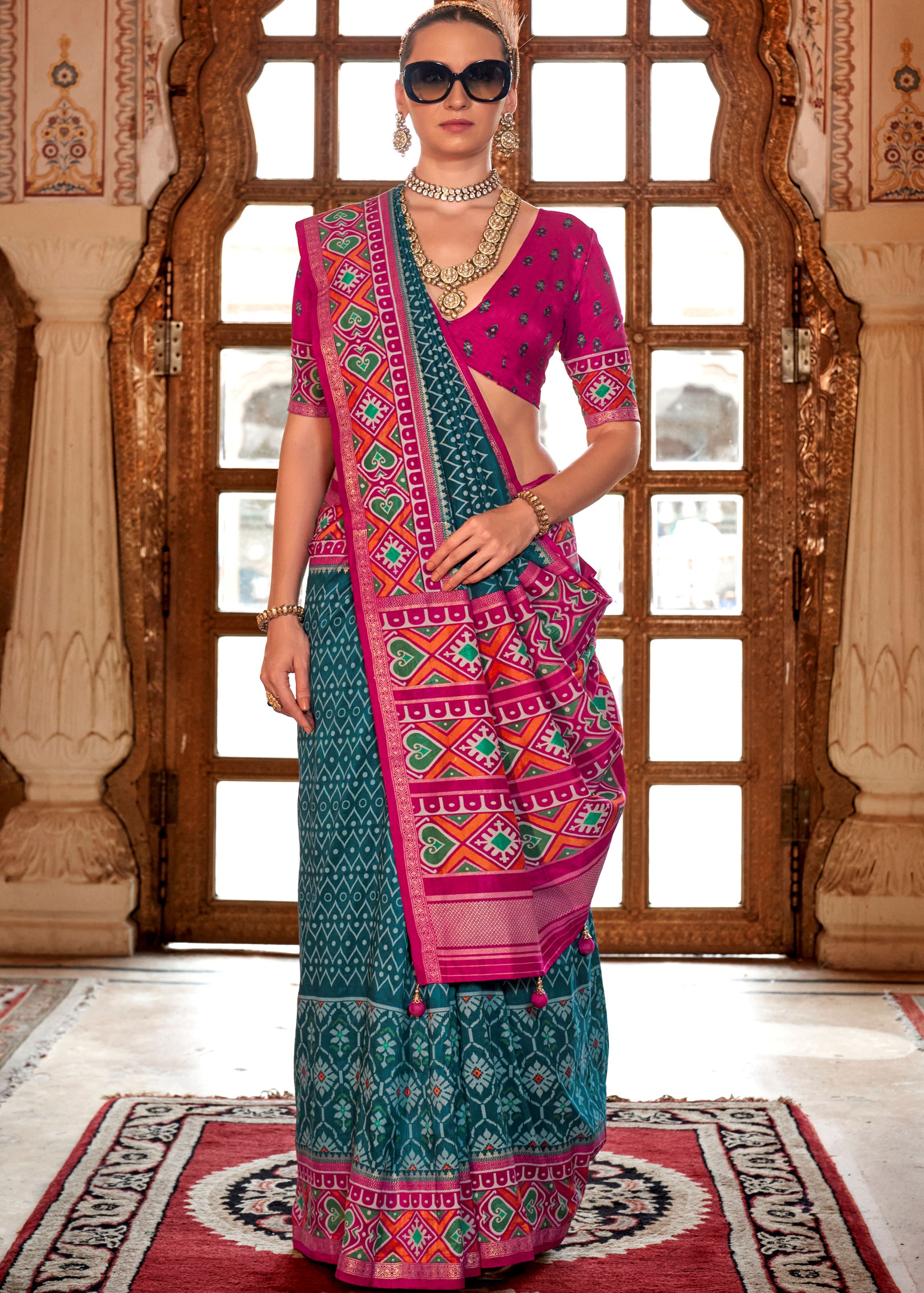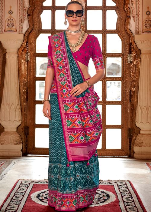 Teal Blue Silk Saree With Digital Patola Print
