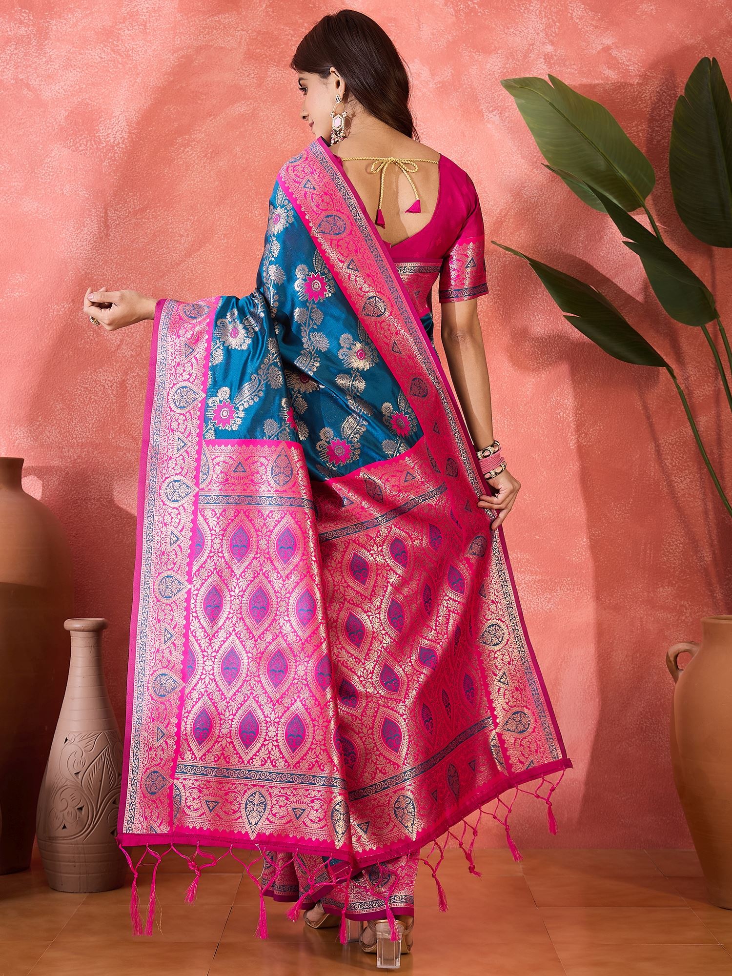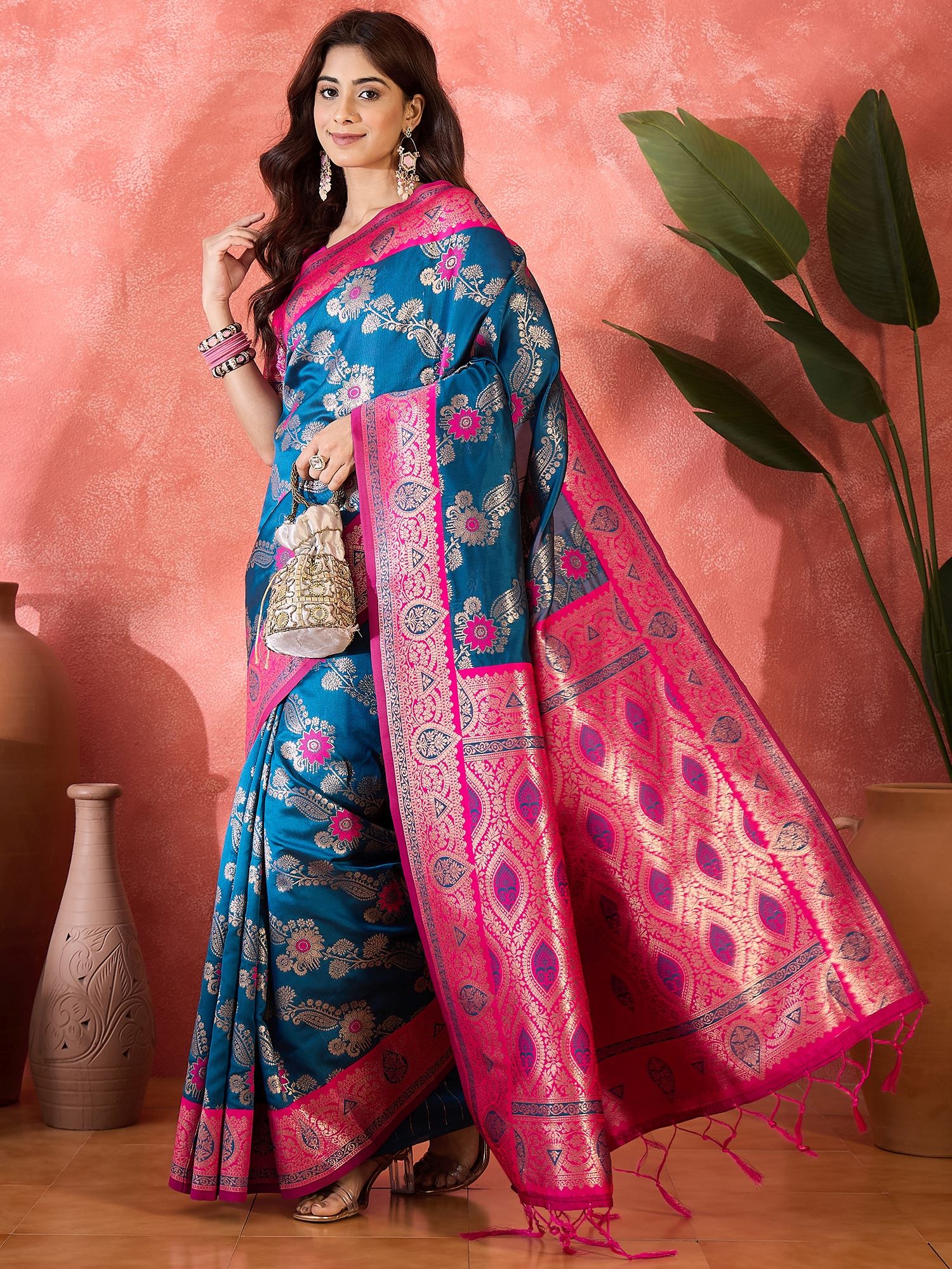 Teal Blue Silk Woven Designer Partywear Ethnic Silk Saree