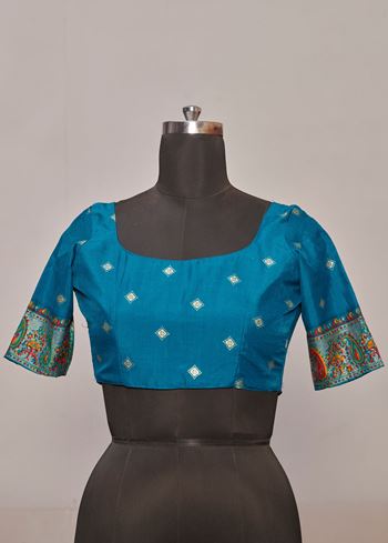 Paired with a matching teal silk blend blouse, this saree forms a harmonious and polished ensemble. Its lightweight yet opulent texture allows for effortless draping while maintaining a refined and regal appearance. The intricate woven craftsmanship highlights traditional artistry, while the floral prints add a contemporary touch. Perfect for accessorizing with statement jewelry for evening events or subtle pieces for daytime celebrations, this saree offers versatility and timeless appeal.
